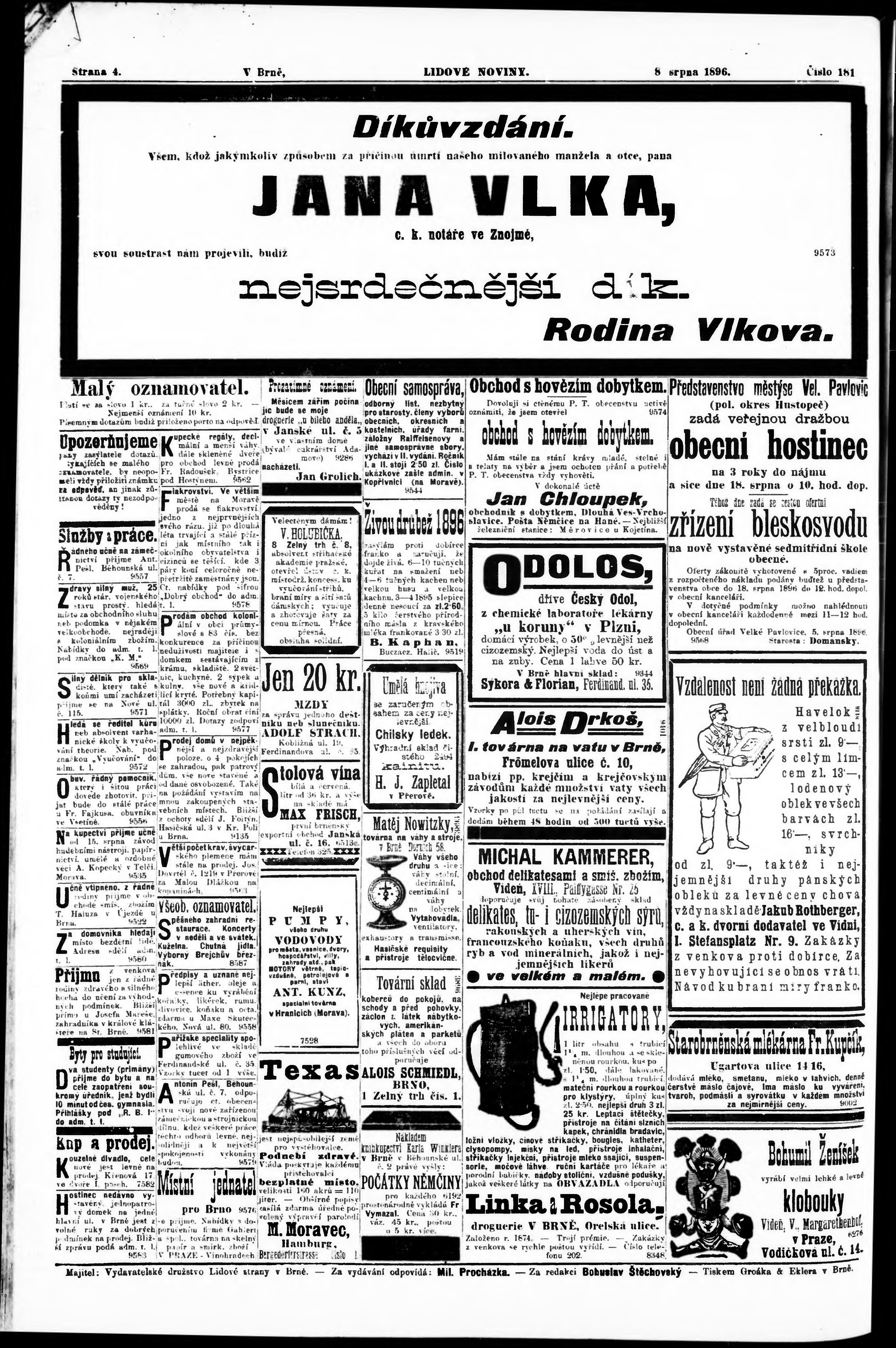 * Datum vydání výtisku: 8.8.1896 Číslo výtisku: 181