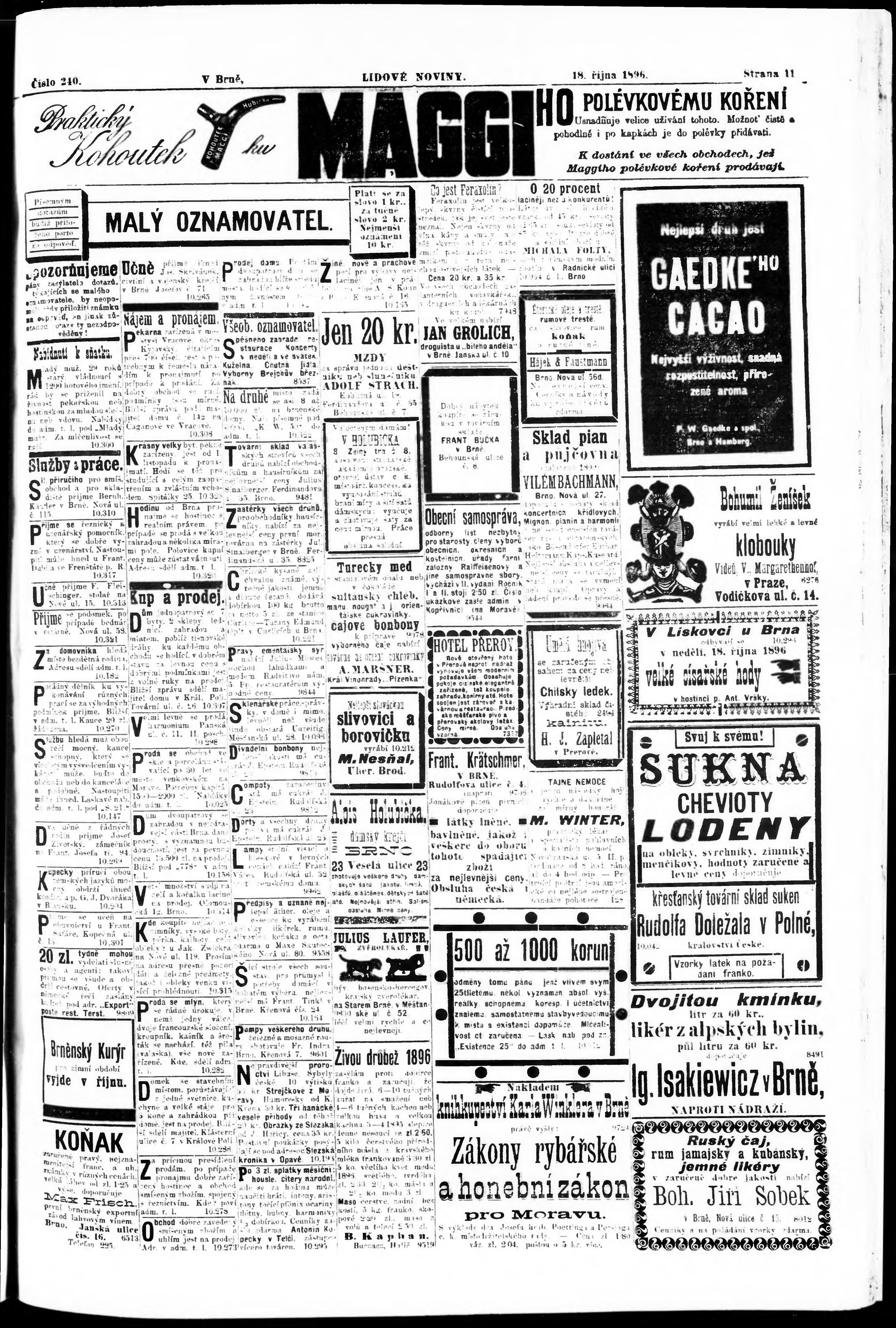 * Datum vydání výtisku: 18.10.1896 Číslo výtisku: 240 Poznámky k výtisku: nekvalitní předloha;