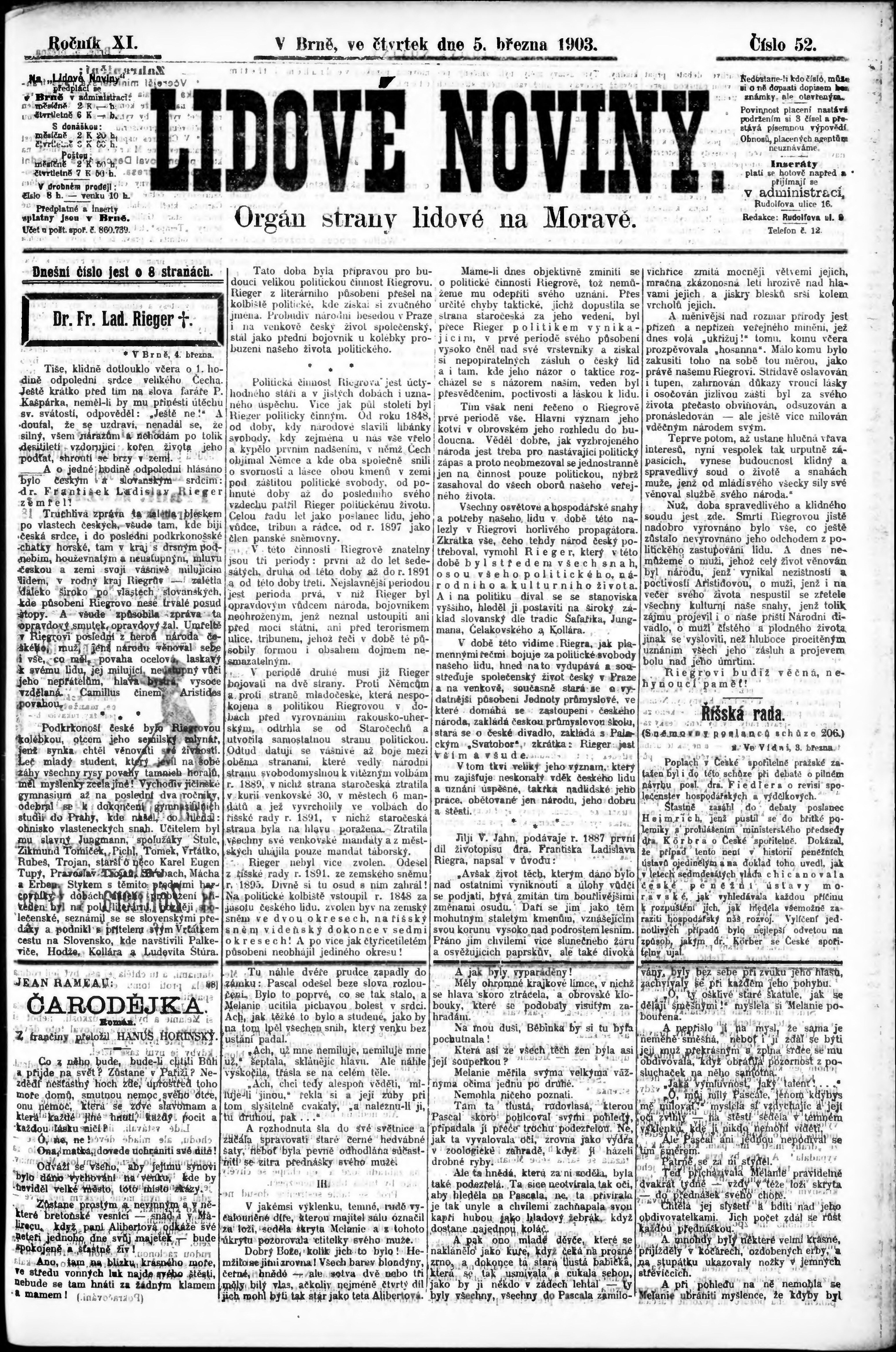 * Datum vydání výtisku: 5.3.1903 Číslo výtisku: 52