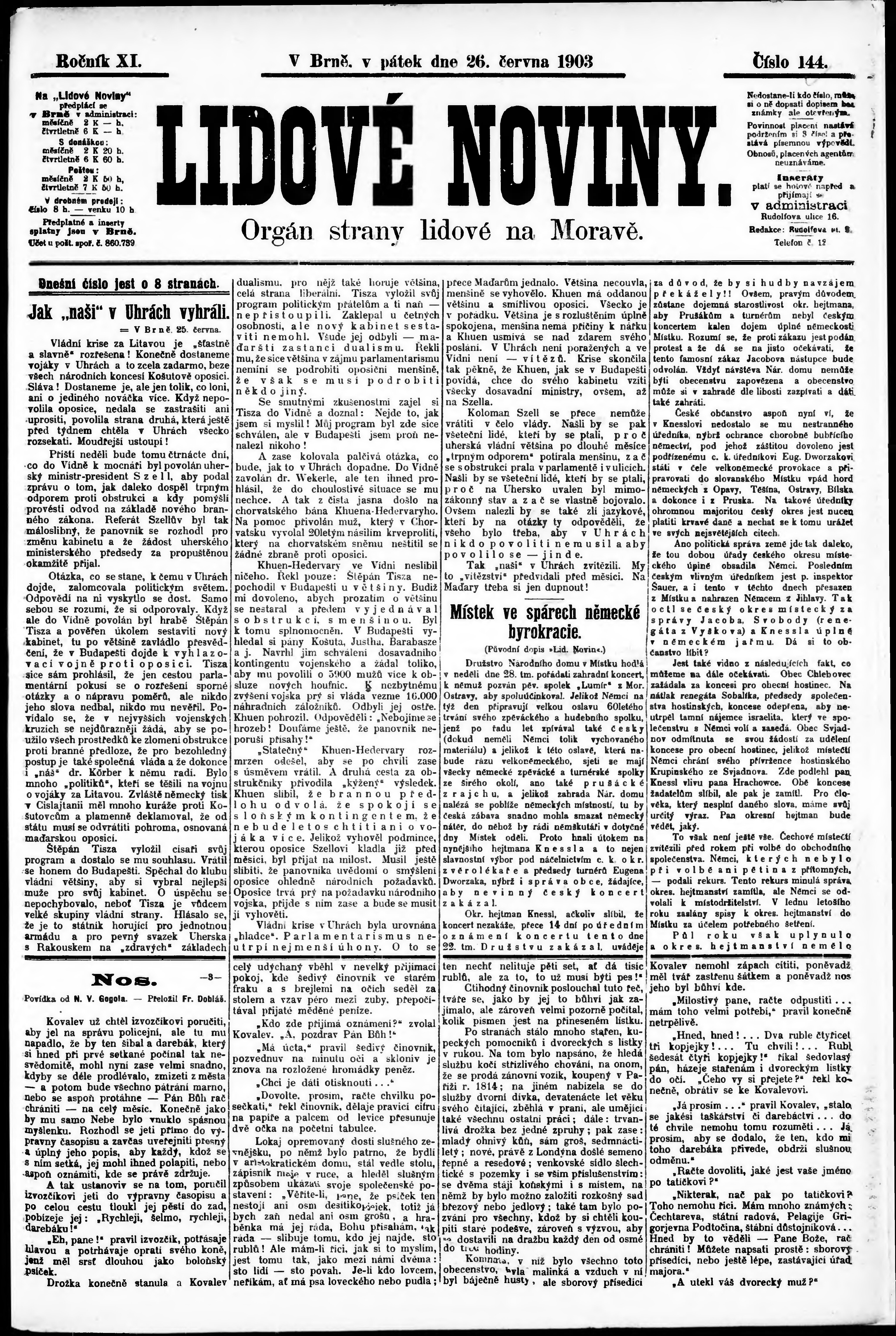 * Datum vydání výtisku: 26.6.1903 Číslo výtisku: 144 Poznámky k výtisku: s. 2, 4 poškozená předloha;