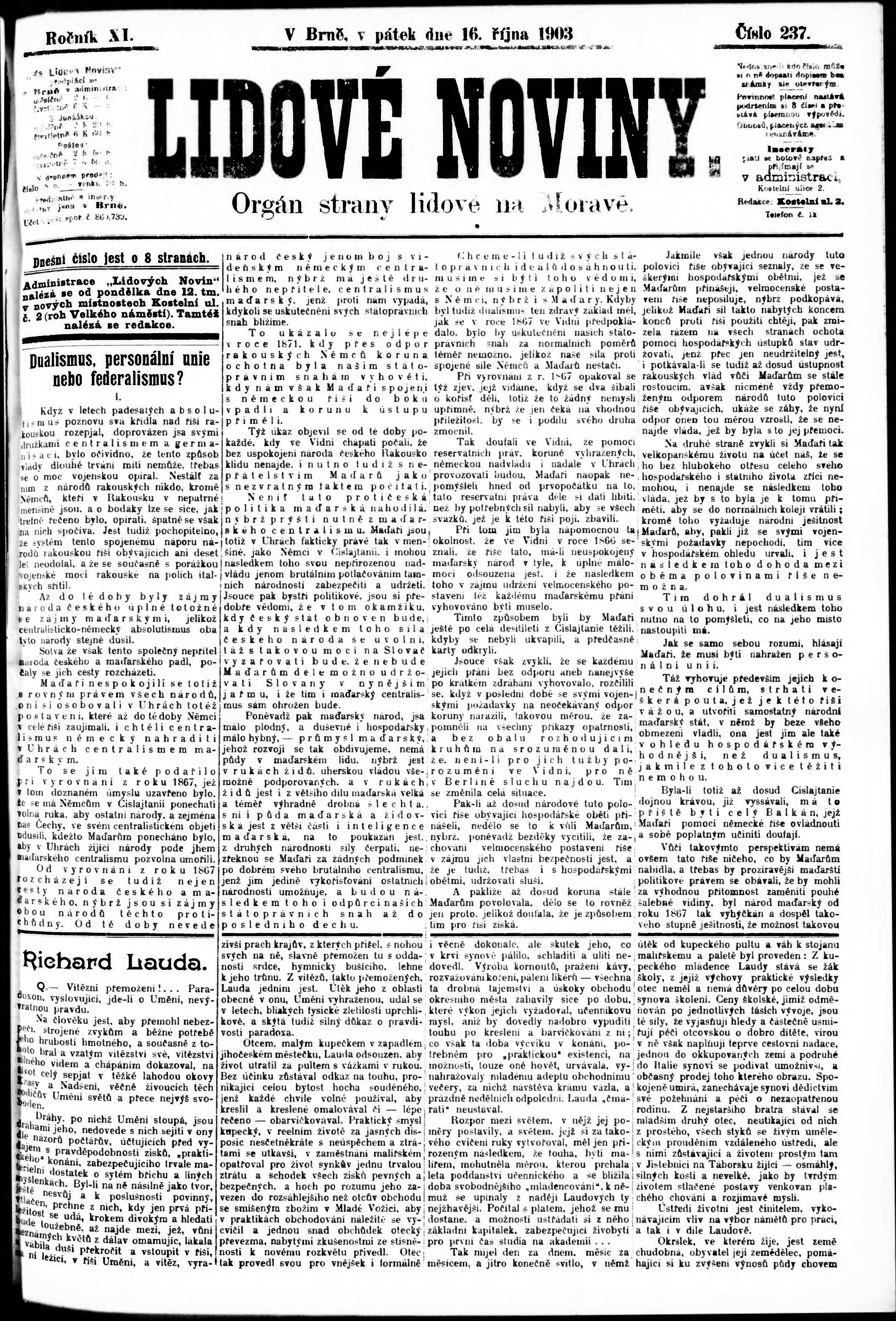 * Datum vydání výtisku: 16.10.1903 Číslo výtisku: 237