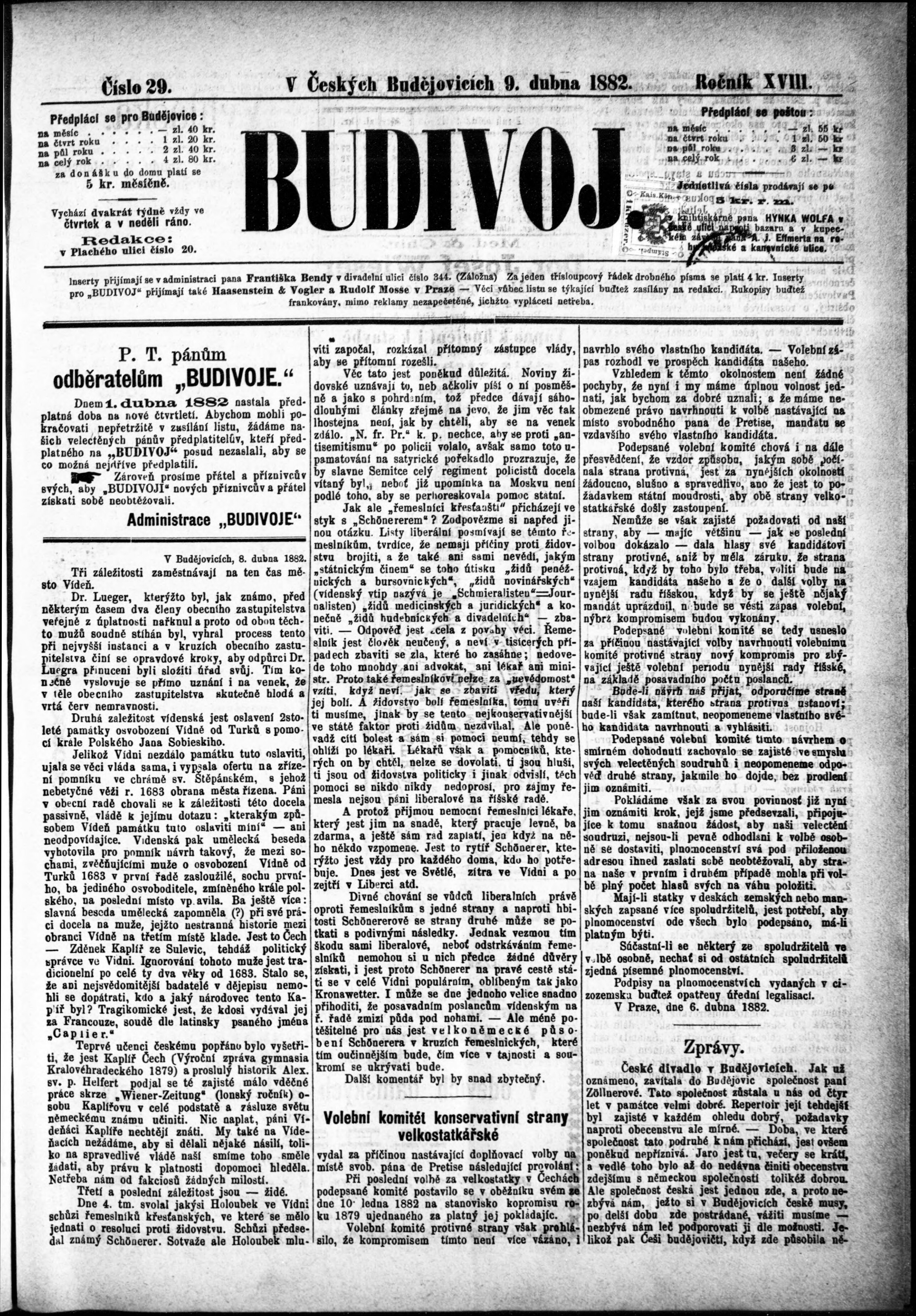 * Datum vydání výtisku: 9.4.1882 Číslo výtisku: 29