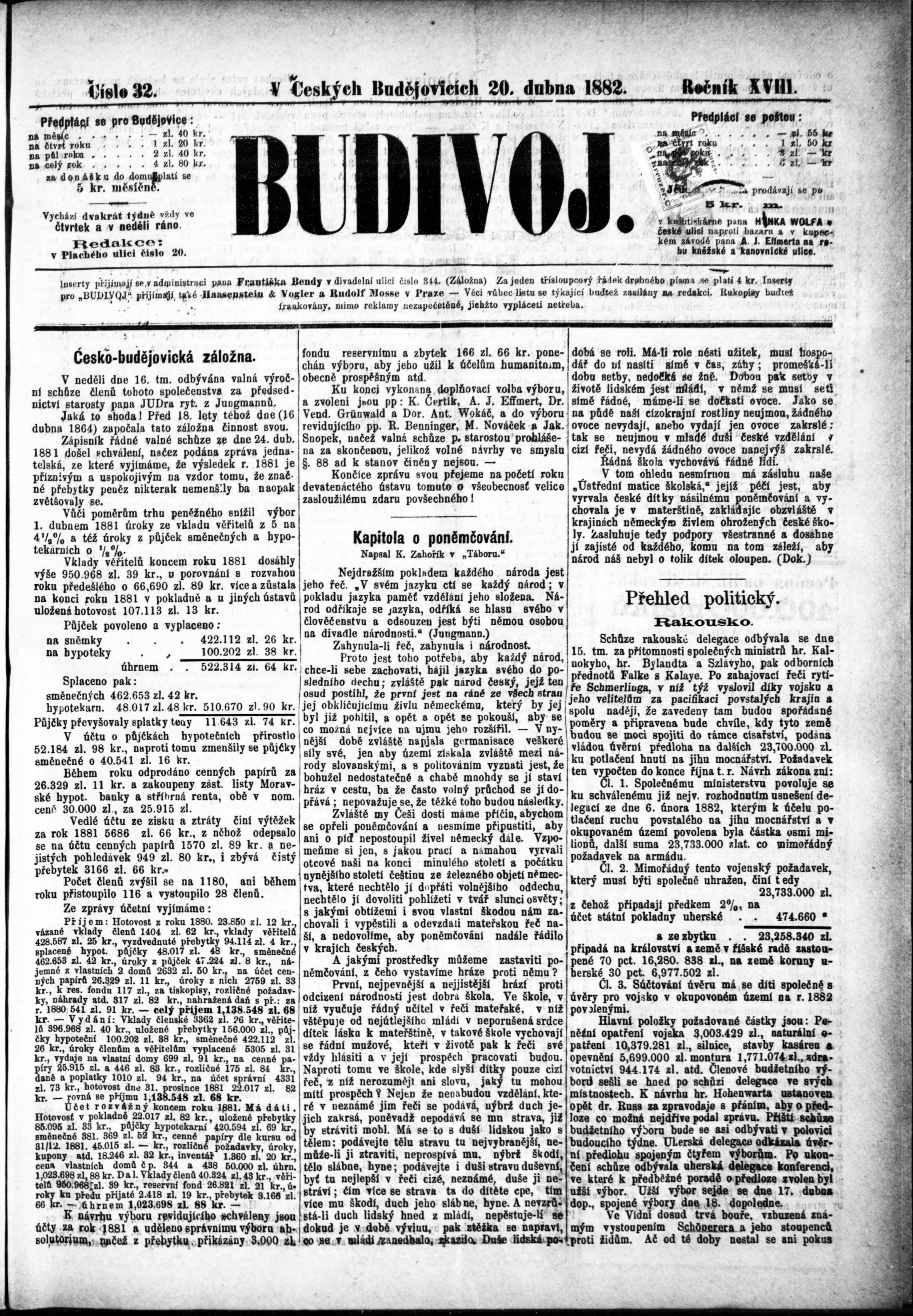* Datum vydání výtisku: 20.4.1882 Číslo výtisku: 32 Poznámky k výtisku: s. (4) nekvalitní předloha;