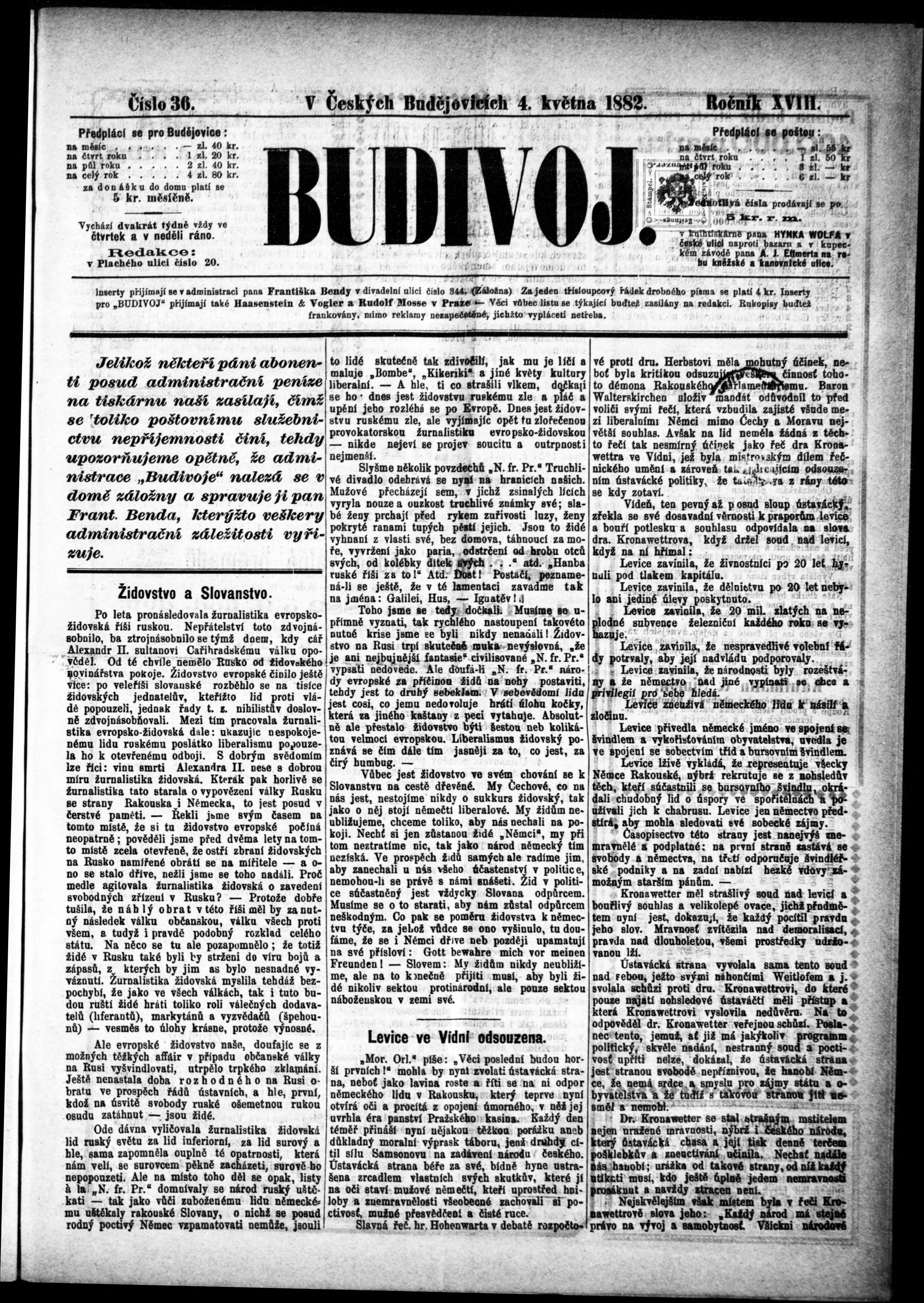* Datum vydání výtisku: 4.5.1882 Číslo výtisku: 36 Poznámky k výtisku: s. (1) nekvalitní předloha;
