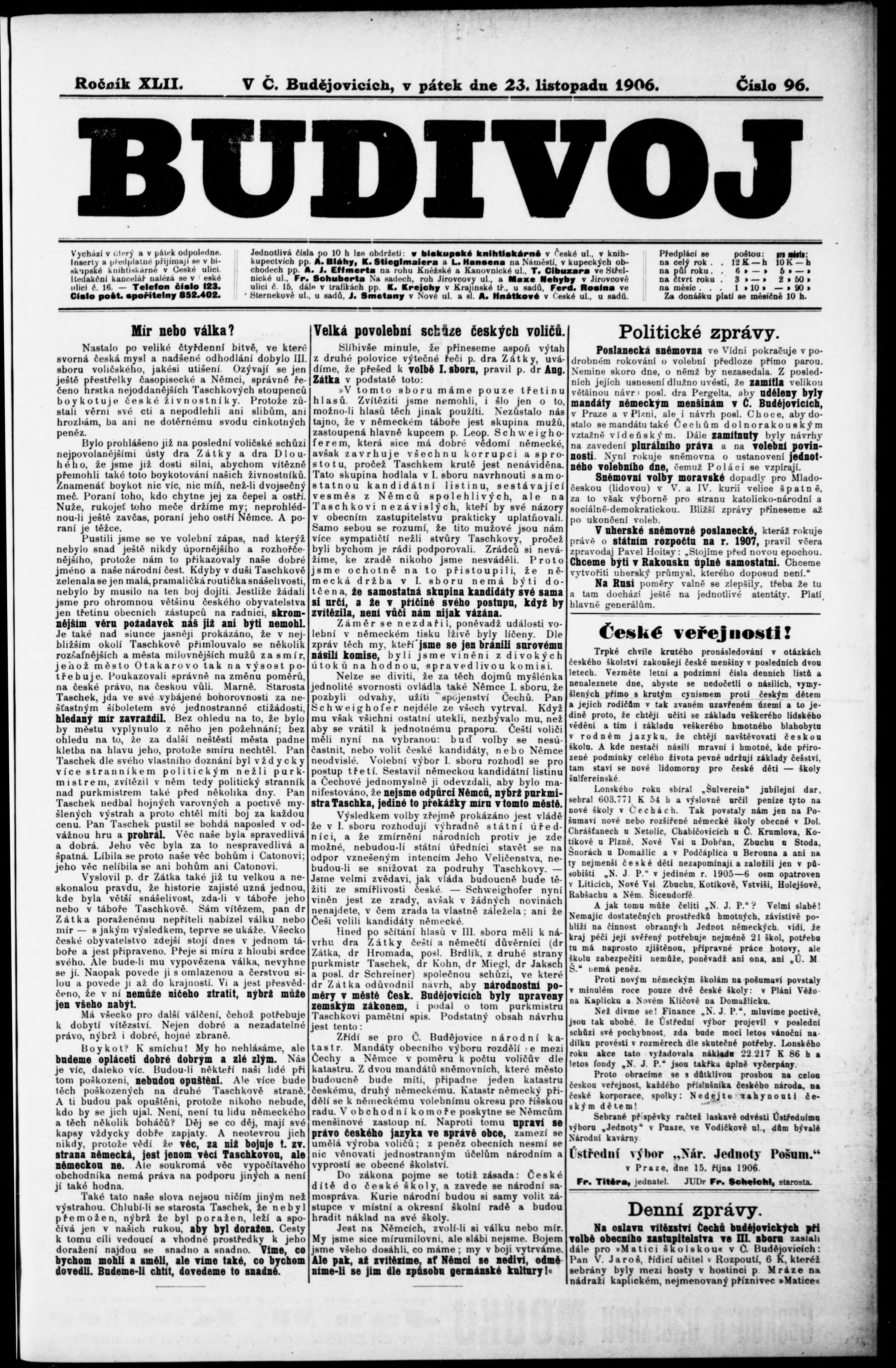 * Datum vydání výtisku: 23.11.1906 Číslo výtisku: 96