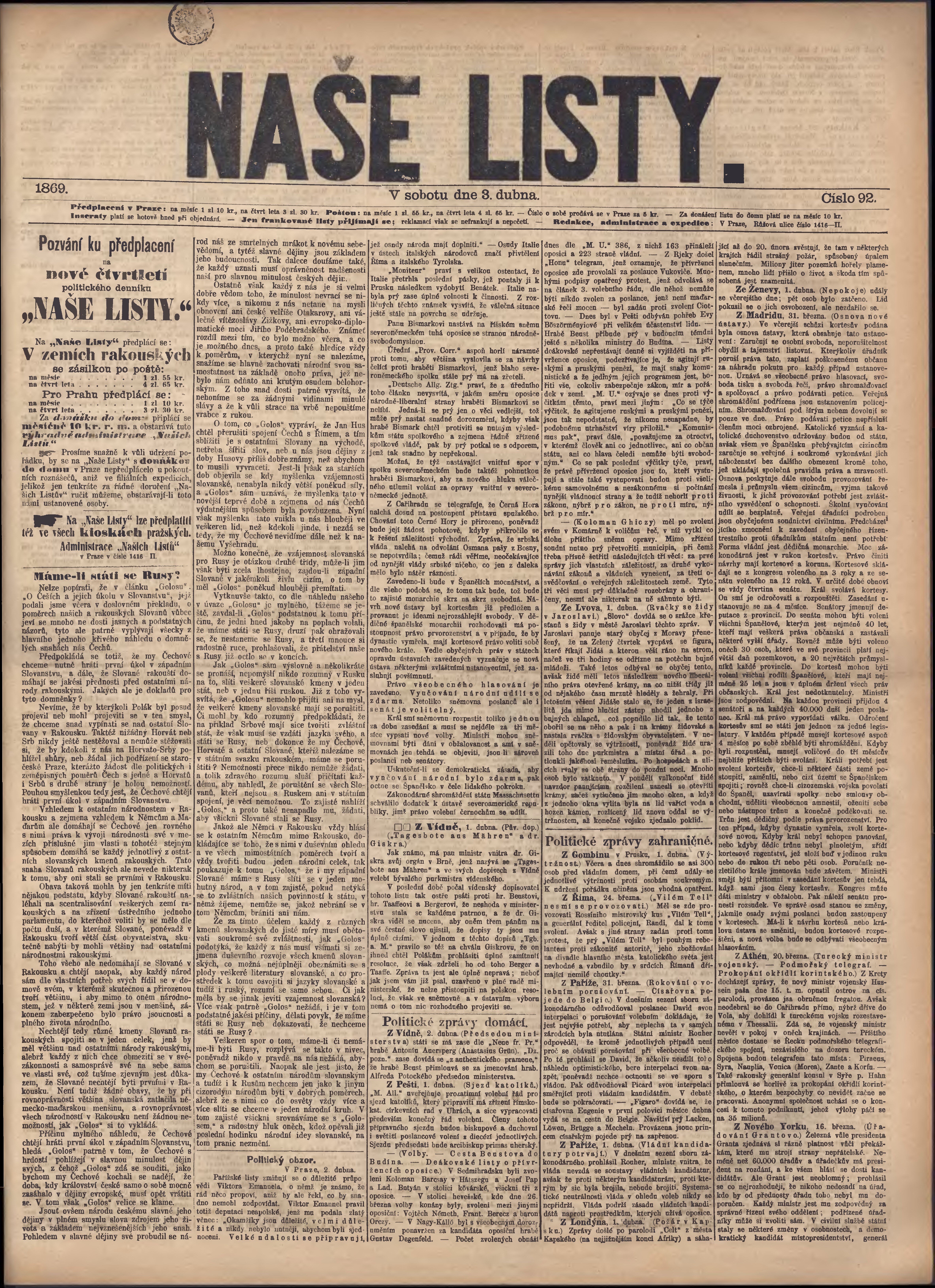 * Datum vydání výtisku: 3.4.1869 Číslo výtisku: 92