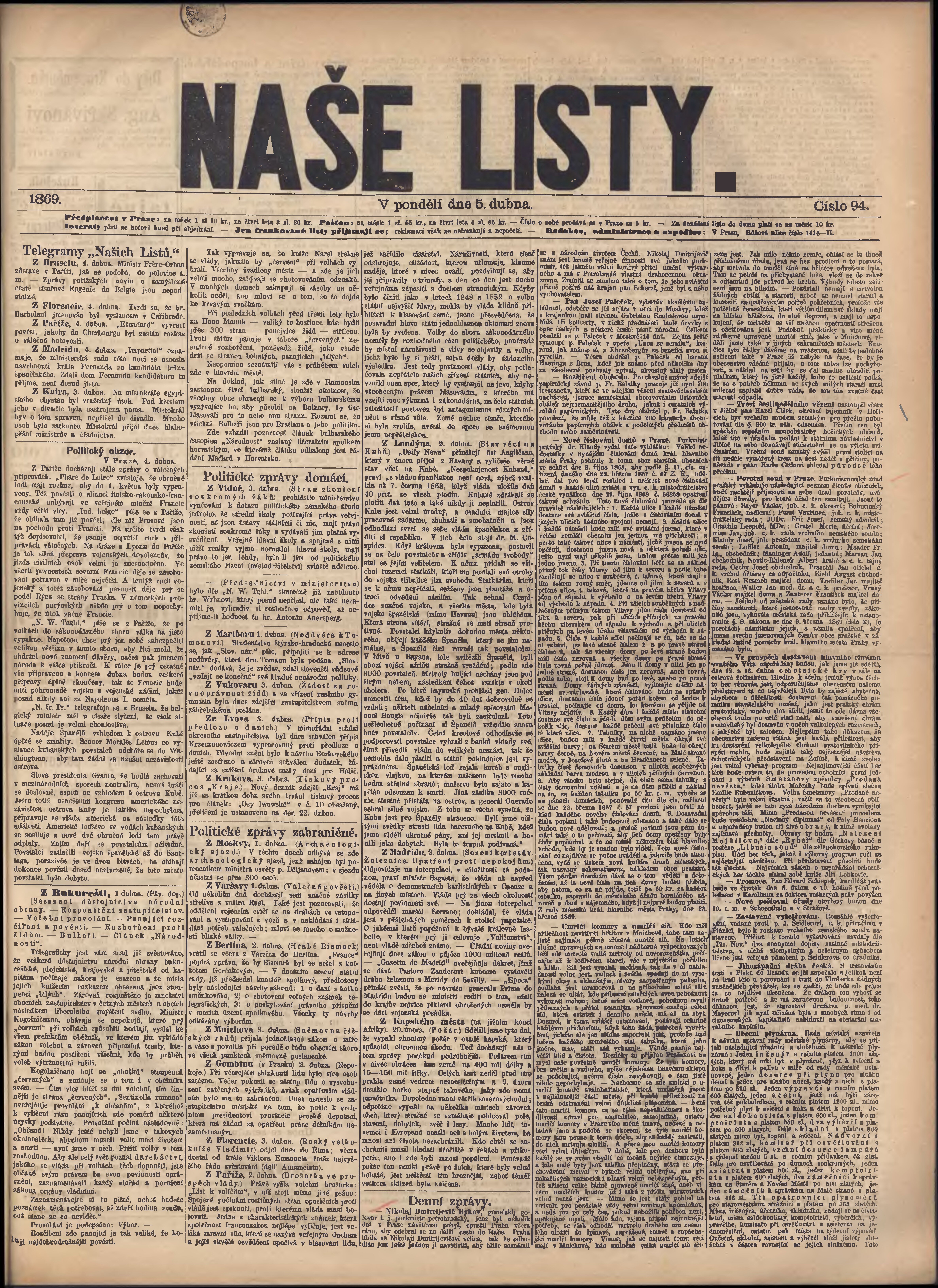 * Datum vydání výtisku: 5.4.1869 Číslo výtisku: 94