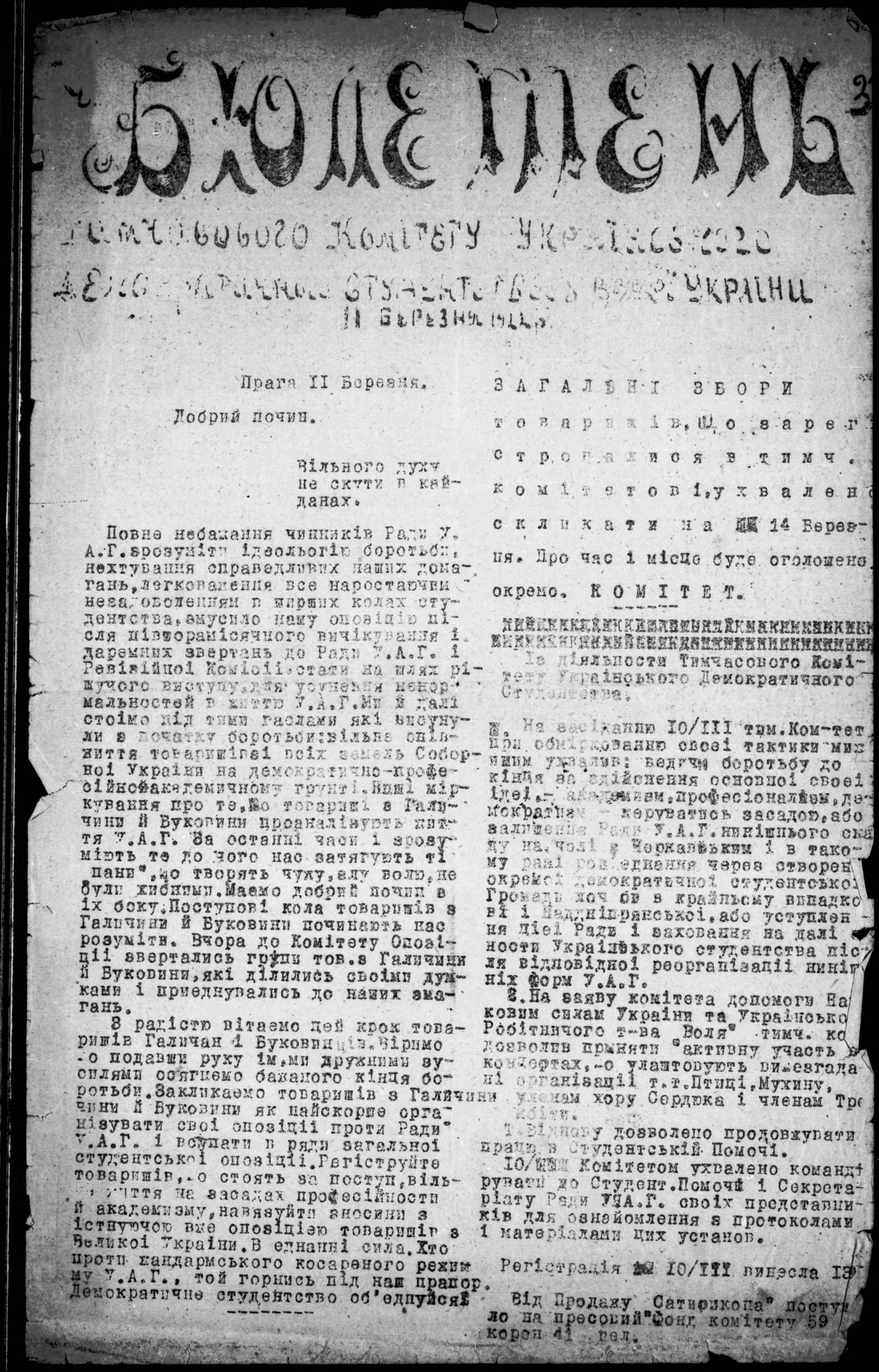 Biuleten' tymchasovoho komitetu ukrains'koho demokratychnoho studenstv...