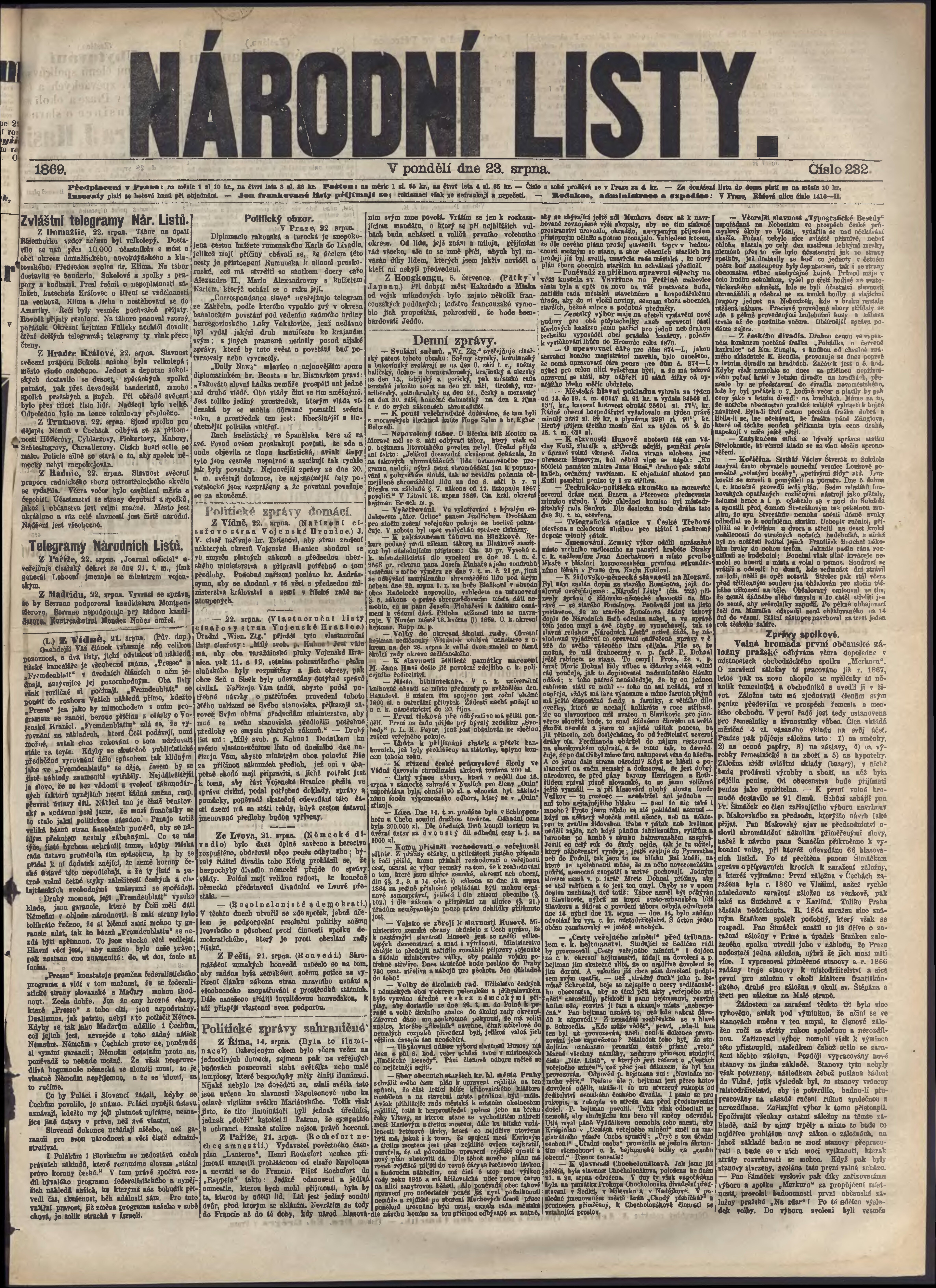 * Datum vydání výtisku: 23.8.1869 Číslo výtisku: 232