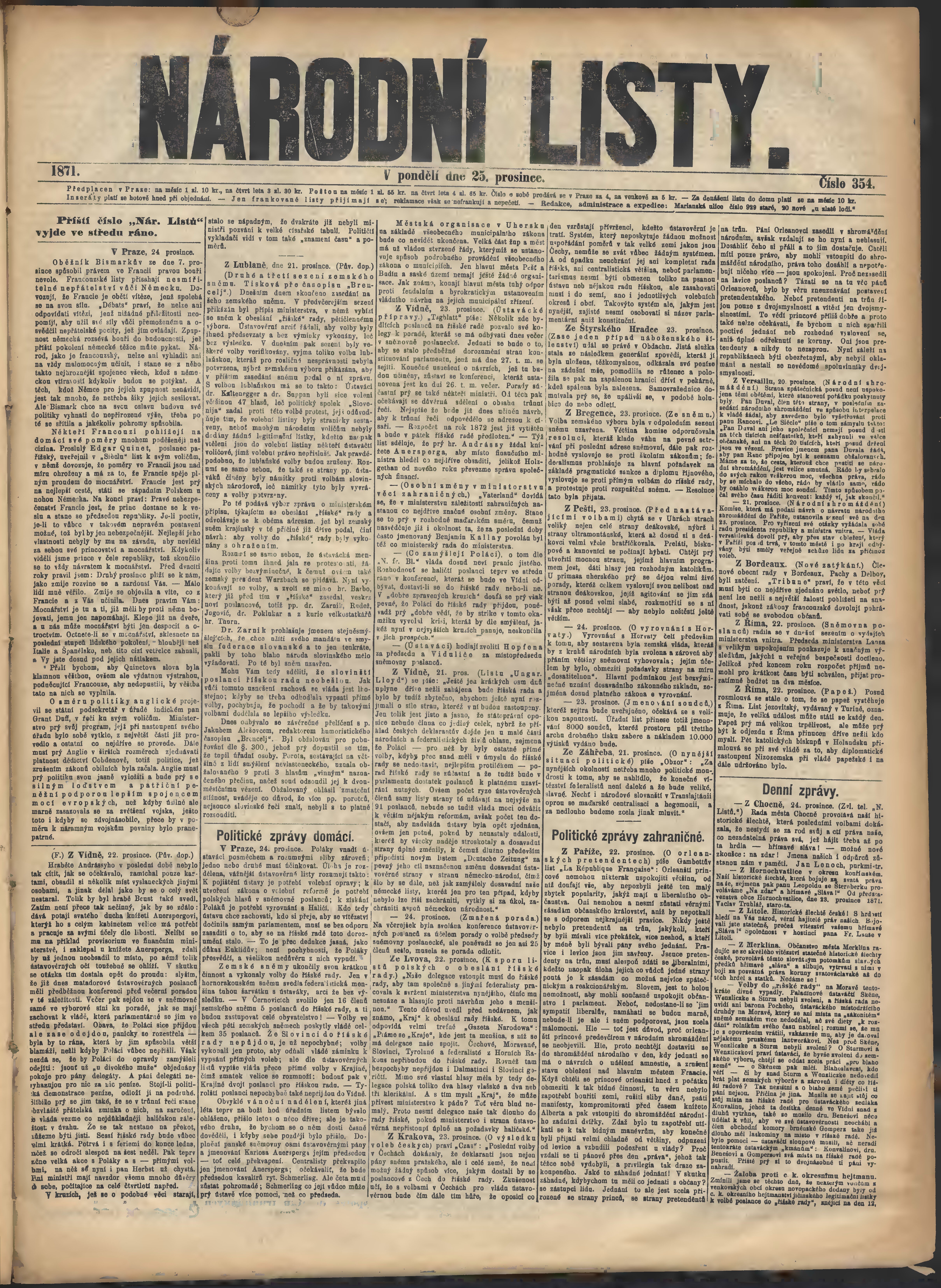 * Datum vydání výtisku: 25.12.1871 Číslo výtisku: 354