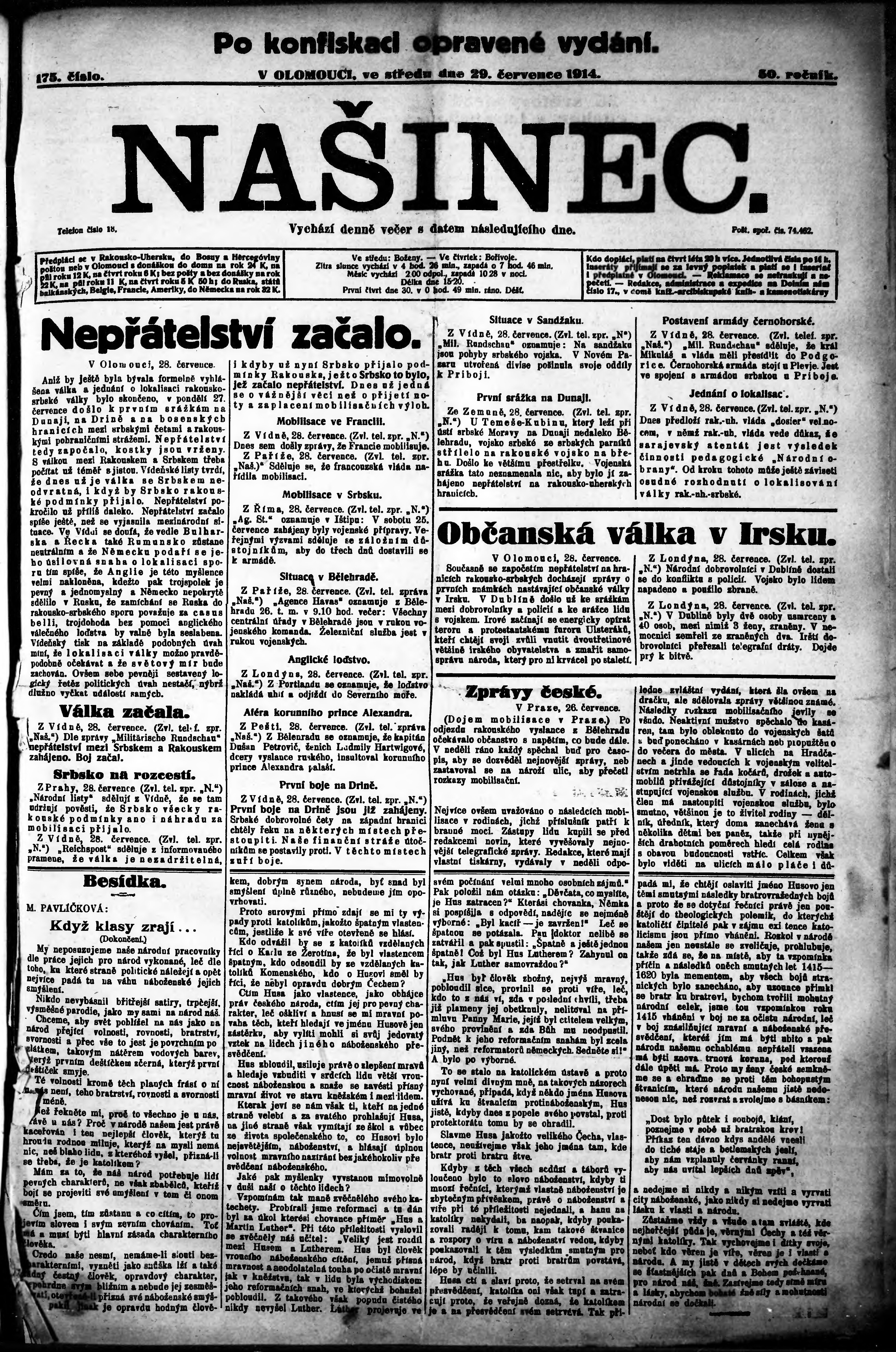 * Datum vydání výtisku: 29.7.1914 Číslo výtisku: 175 Poznámky k výtisku: po konfiskaci opravené vydání;