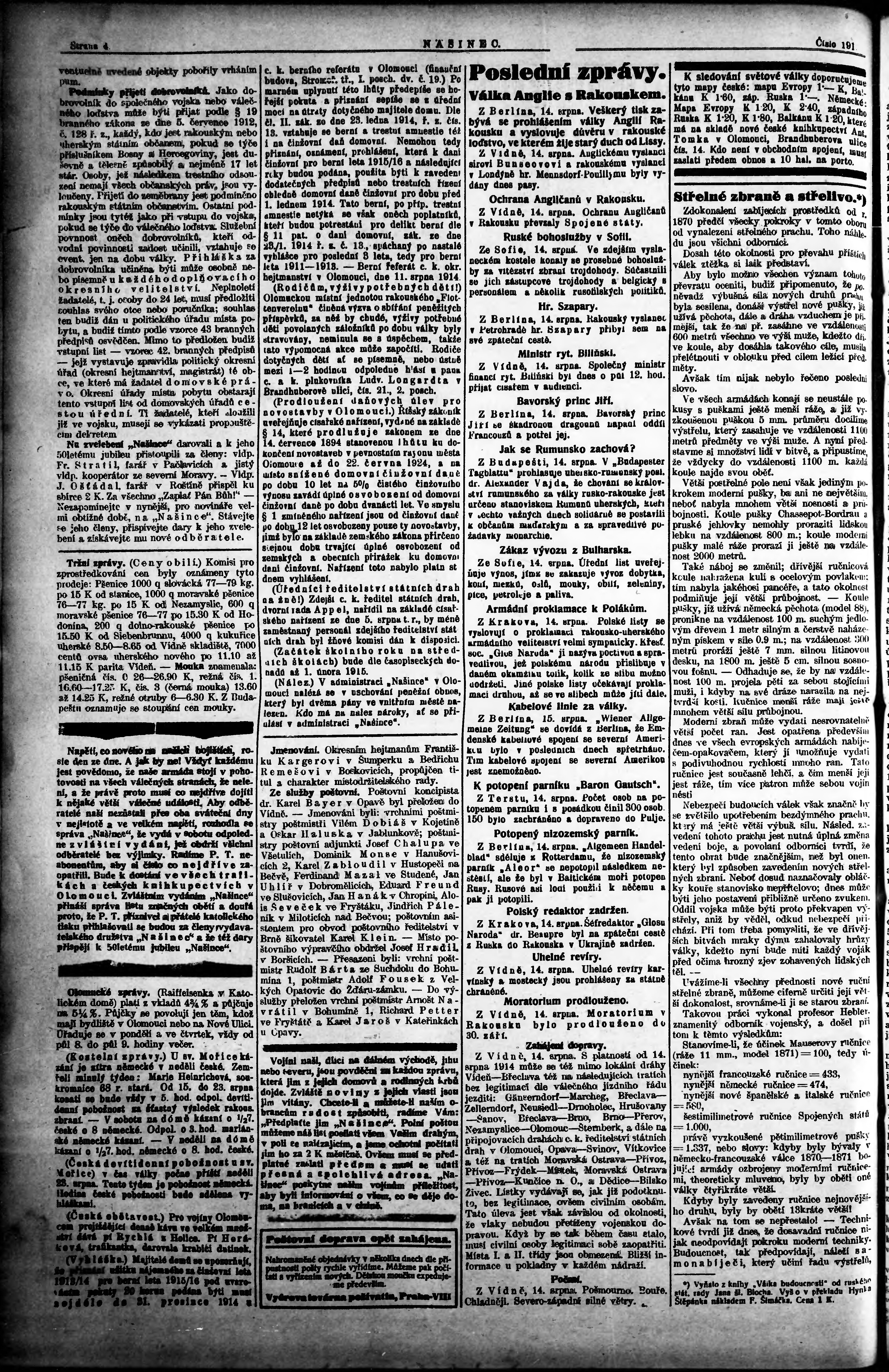 * Datum vydání výtisku: 15.8.1914 Číslo výtisku: 191