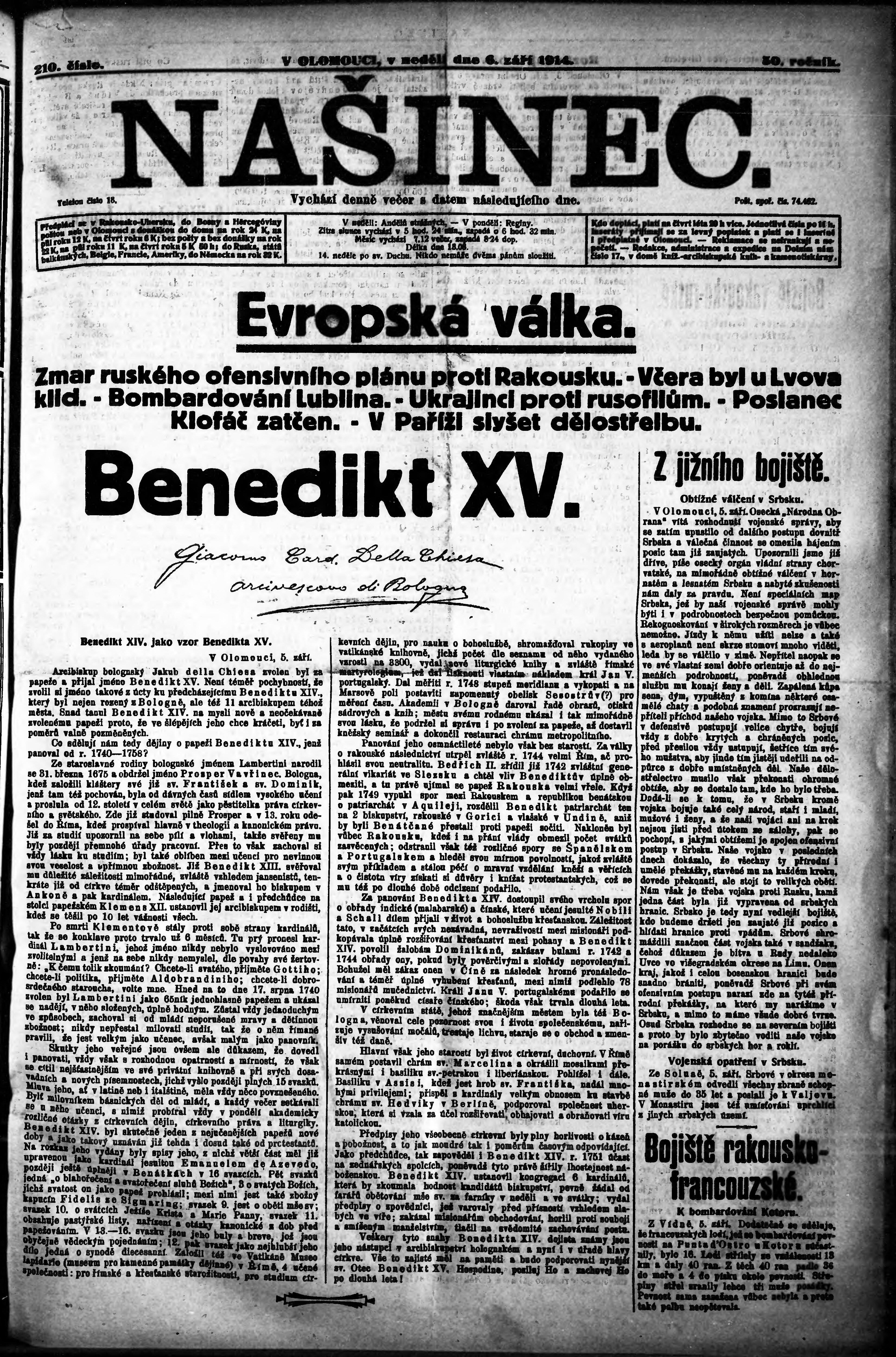 * Datum vydání výtisku: 6.9.1914 Číslo výtisku: 210