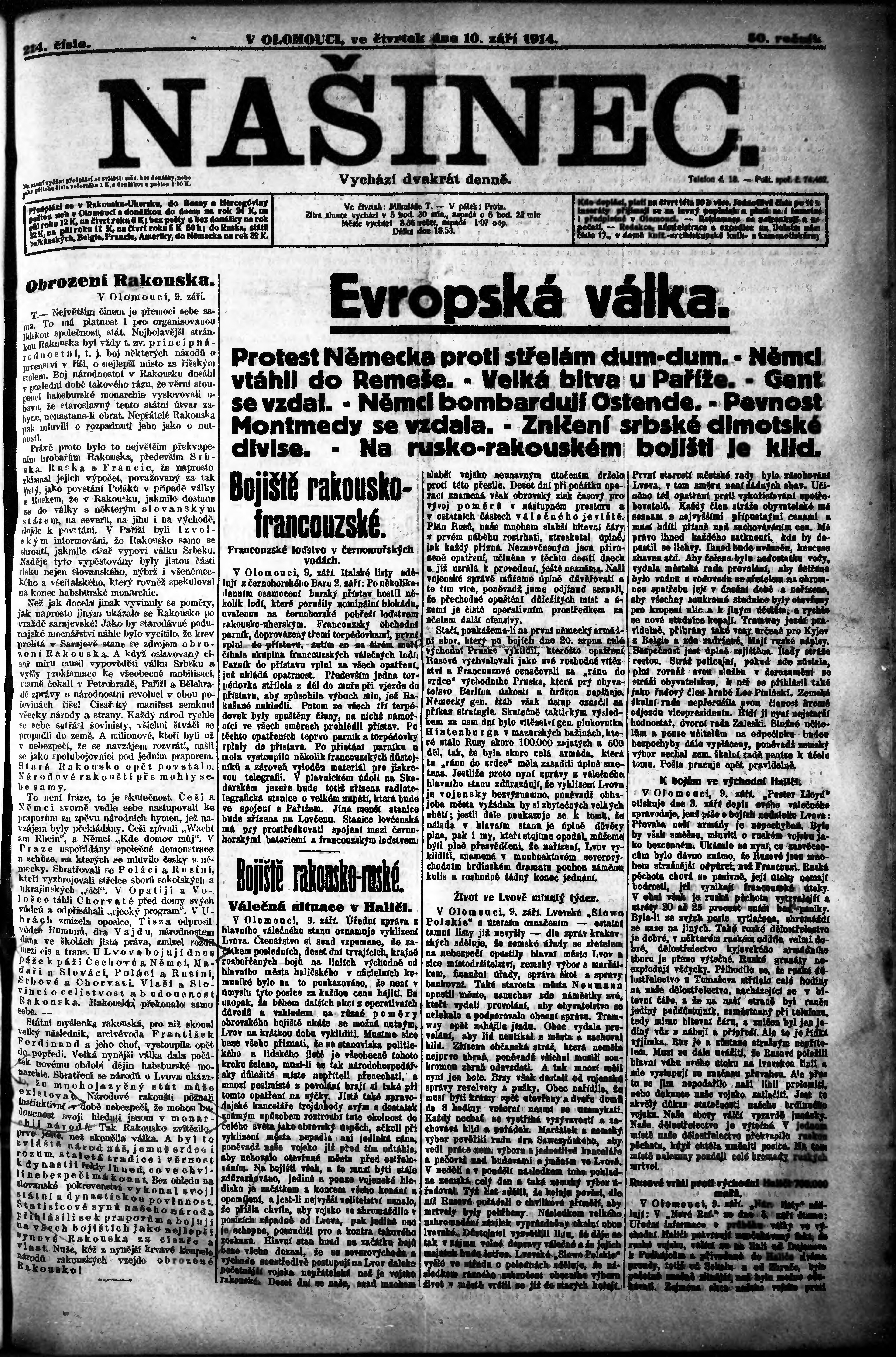 * Datum vydání výtisku: 10.9.1914 Číslo výtisku: 214