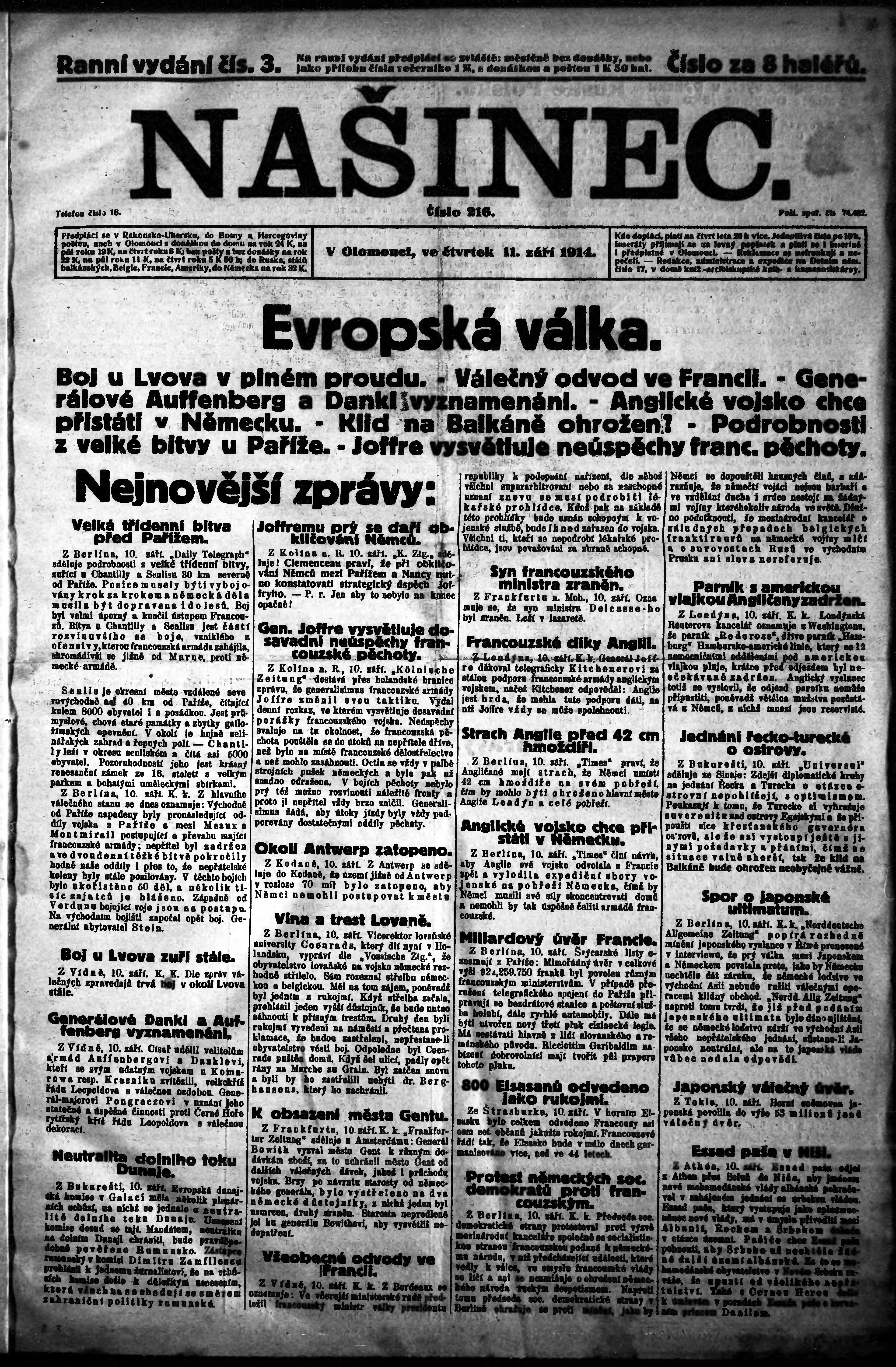 * Datum vydání výtisku: 11.9.1914 Číslo výtisku: 3 Poznámky k výtisku: ranní vydání;