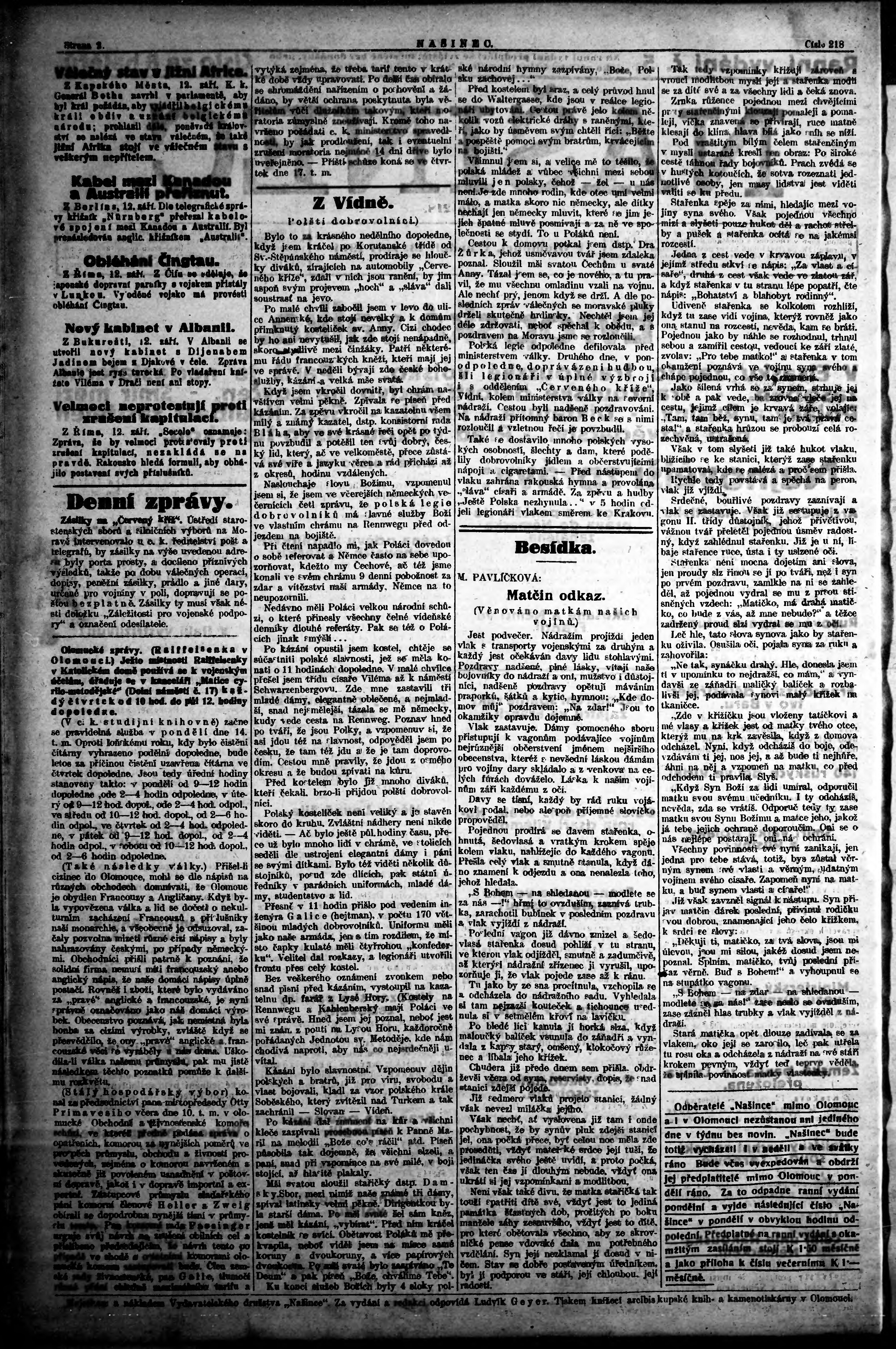 * Datum vydání výtisku: 13.9.1914 Číslo výtisku: 5 Poznámky k výtisku: ranní vydání;