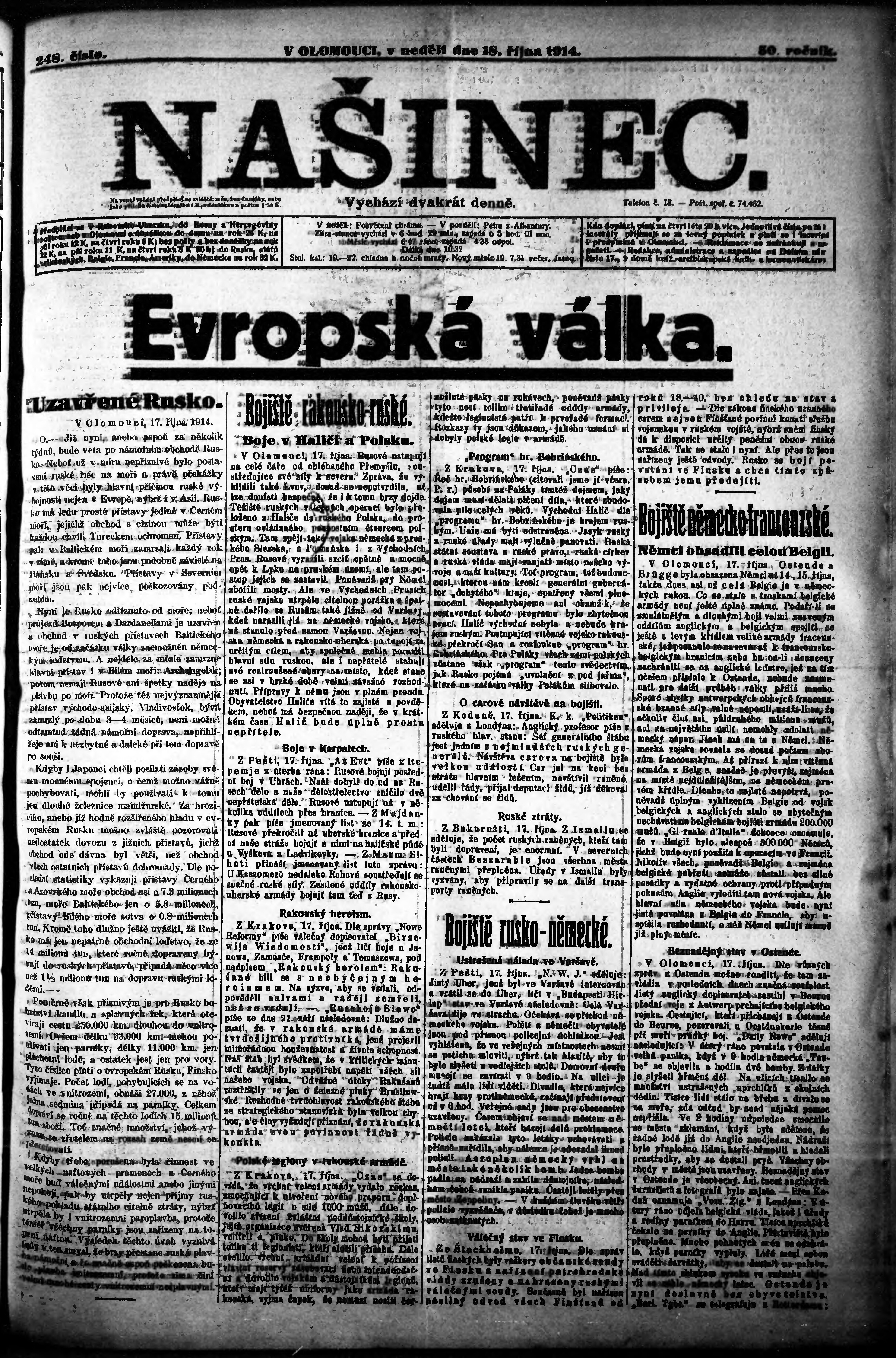 * Datum vydání výtisku: 18.10.1914 Číslo výtisku: 248