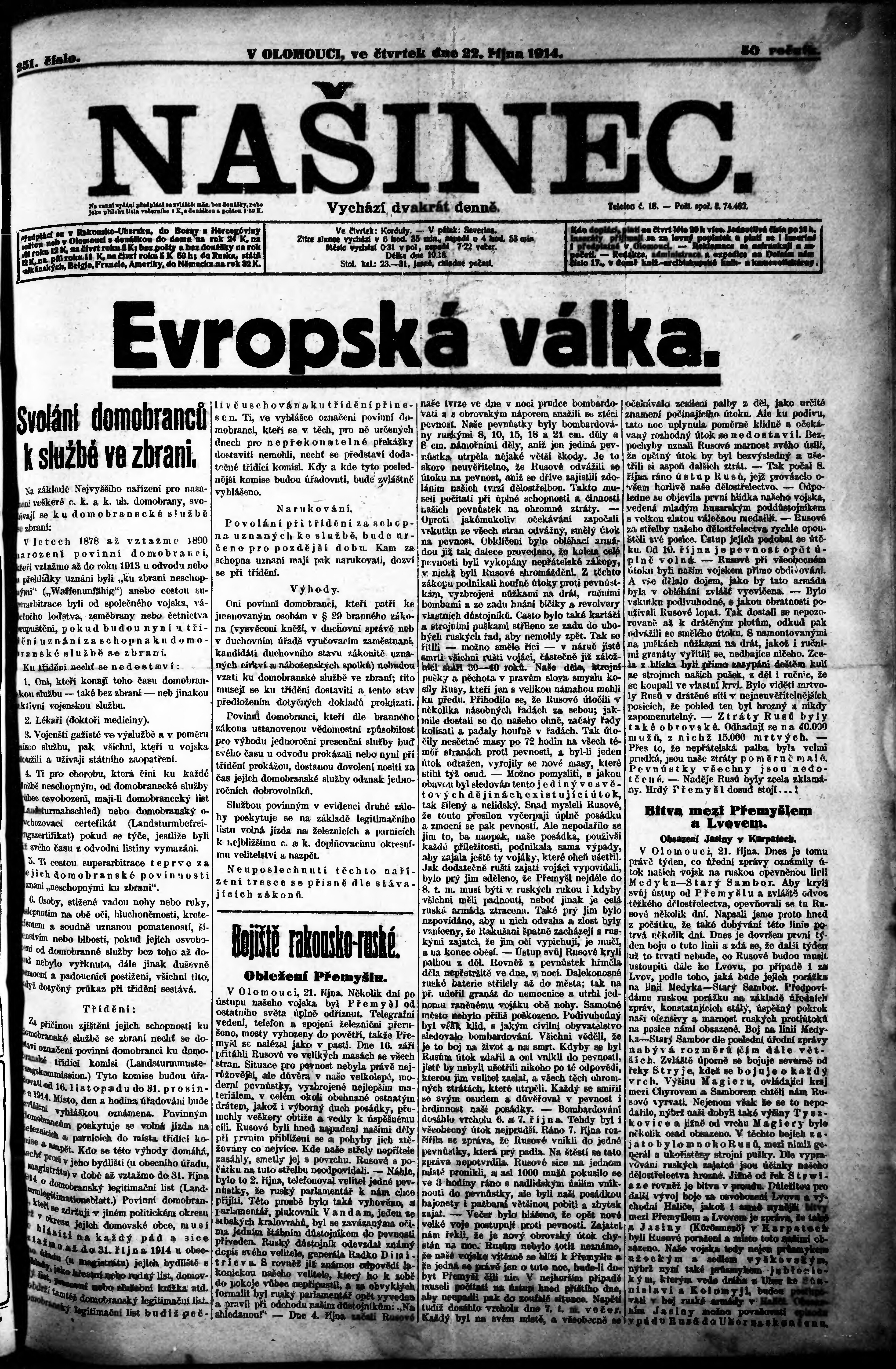 * Datum vydání výtisku: 22.10.1914 Číslo výtisku: 251