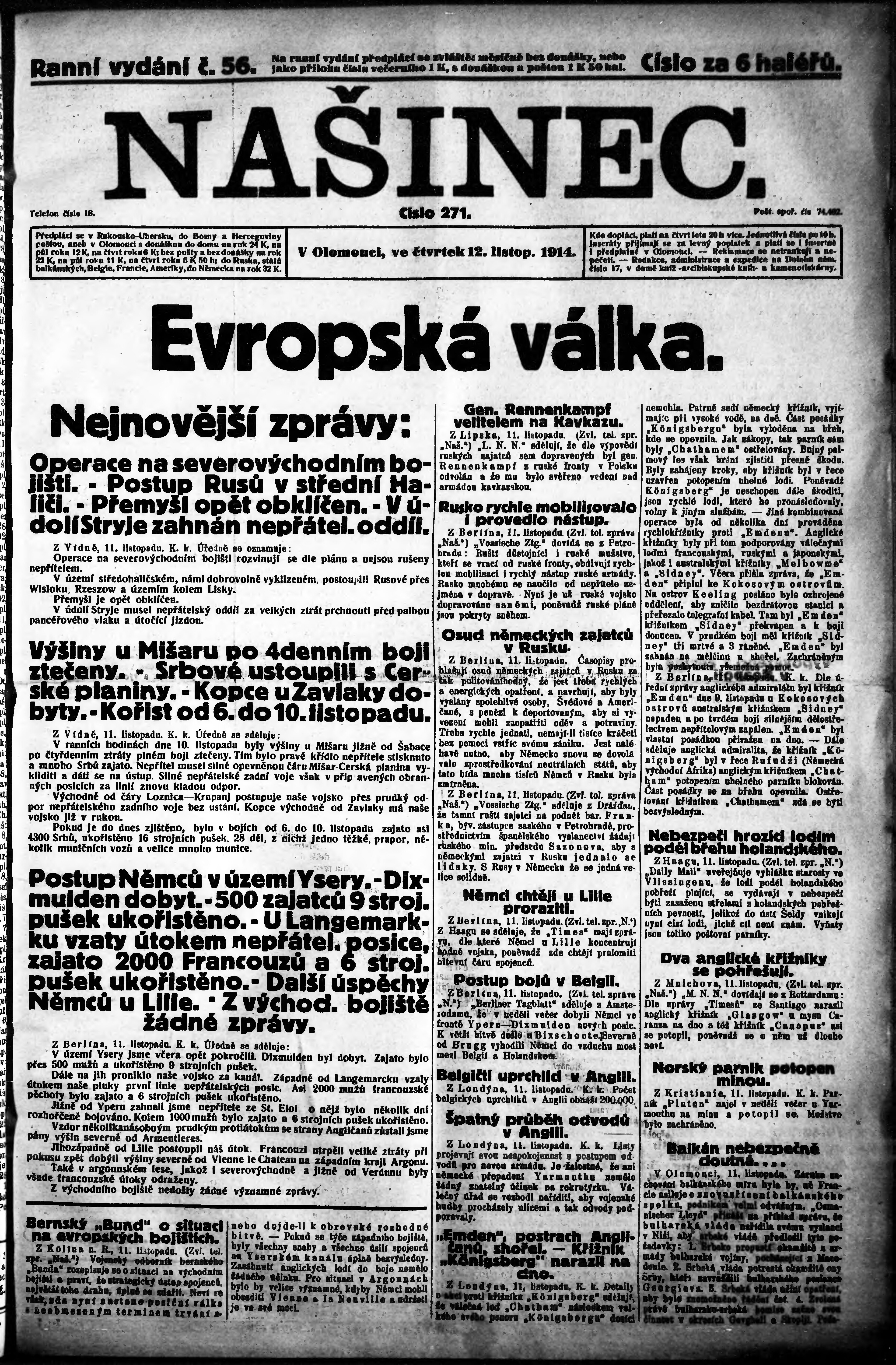 * Datum vydání výtisku: 12.11.1914 Číslo výtisku: 56 Poznámky k výtisku: ranní vydání;