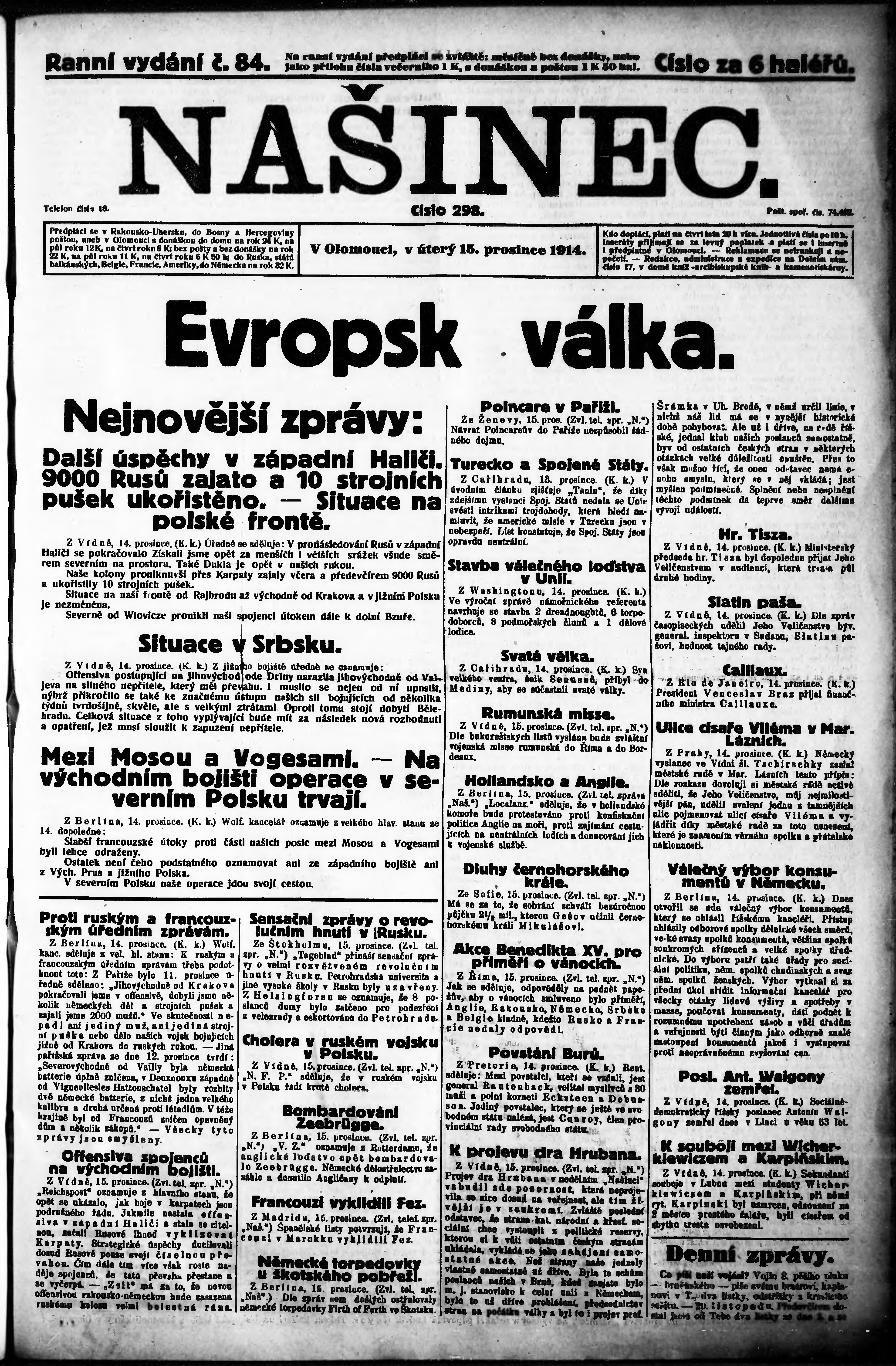 * Datum vydání výtisku: 15.12.1914 Číslo výtisku: 84 Poznámky k výtisku: ranní vydání;