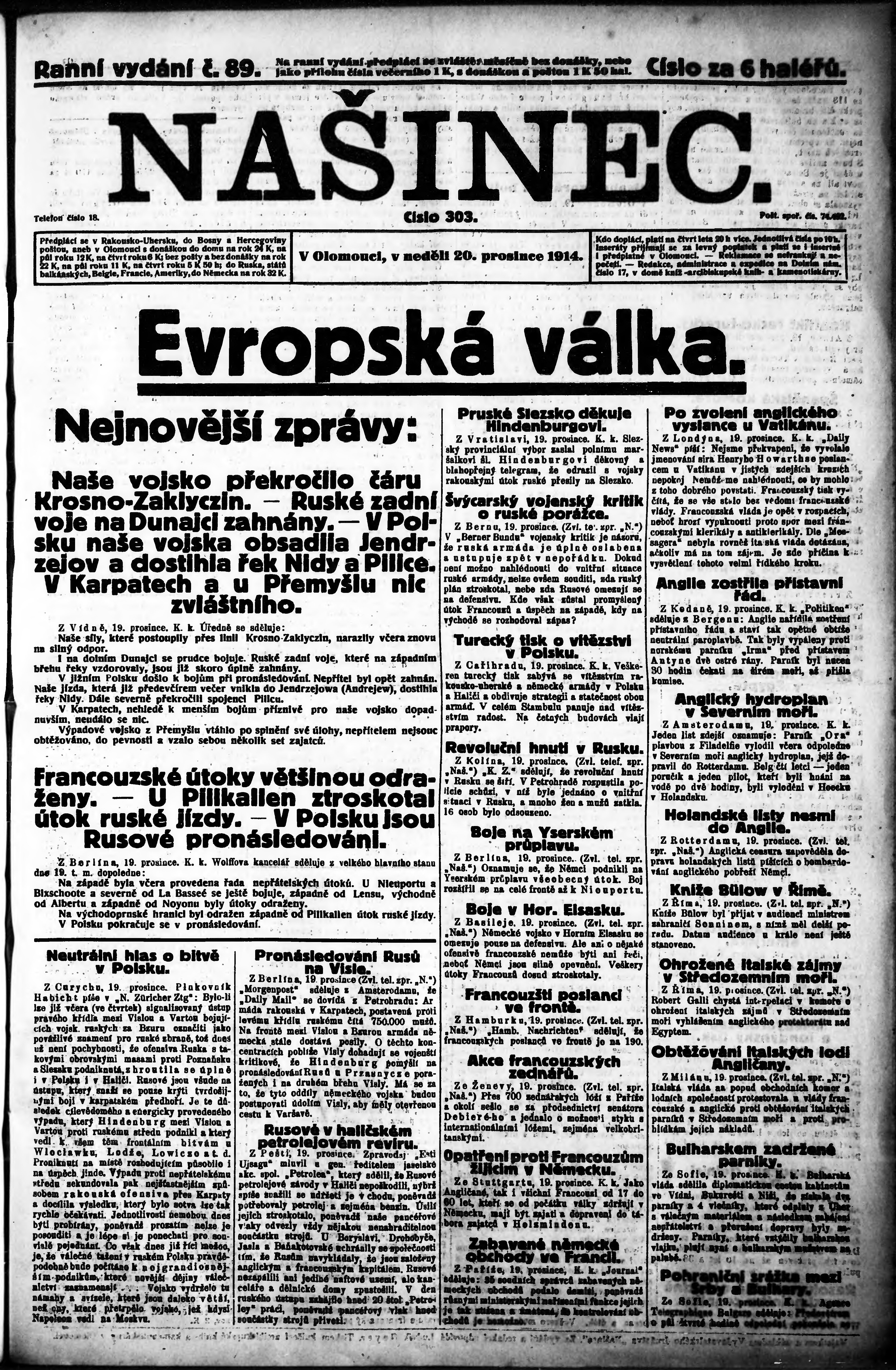 * Datum vydání výtisku: 20.12.1914 Číslo výtisku: 89 Poznámky k výtisku: ranní vydání;