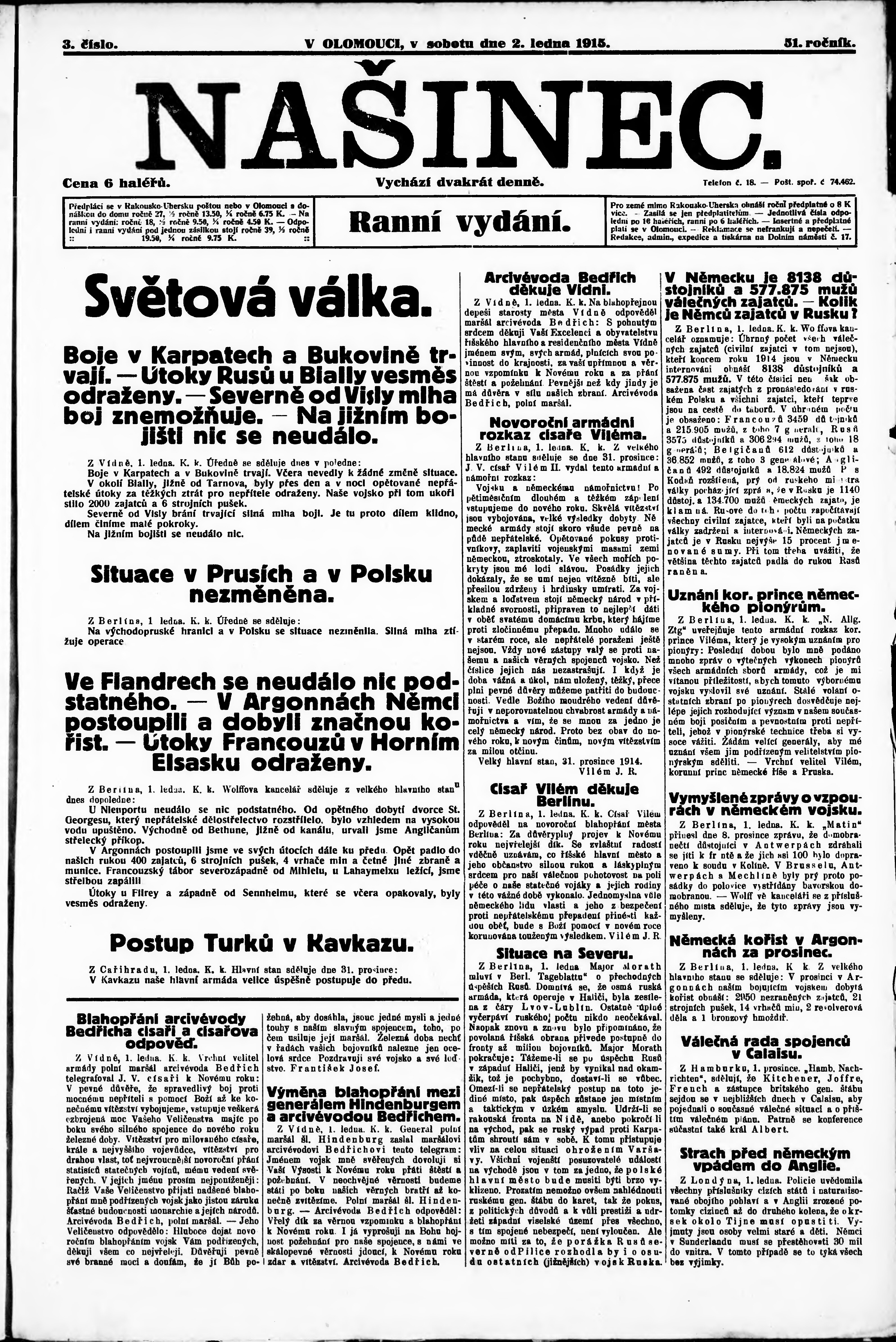 * Datum vydání výtisku: 2.1.1915 Číslo výtisku: 3 Poznámky k výtisku: ranní vydání;