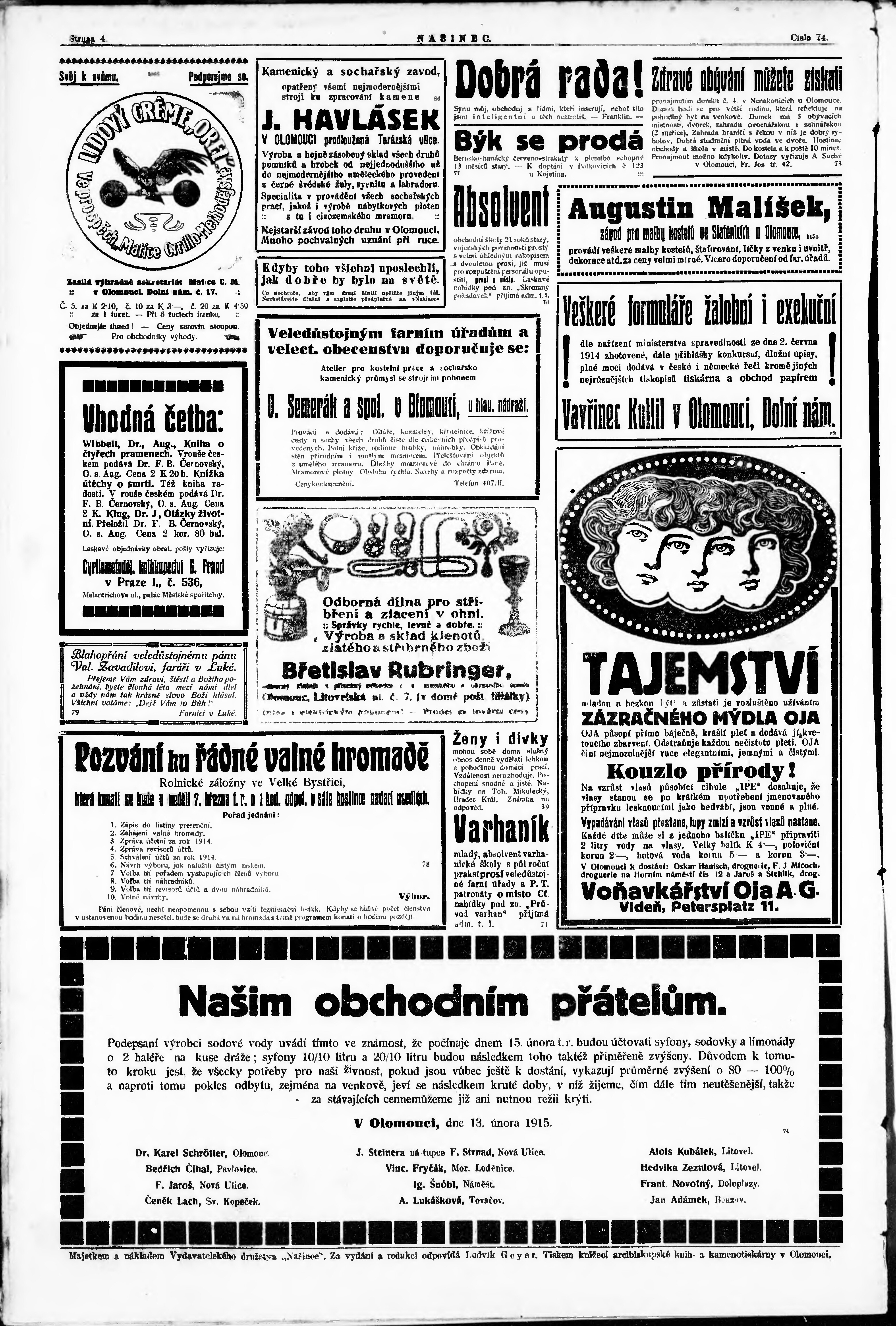 * Datum vydání výtisku: 13.2.1915 Číslo výtisku: 74 Poznámky k výtisku: večerní vydání;
