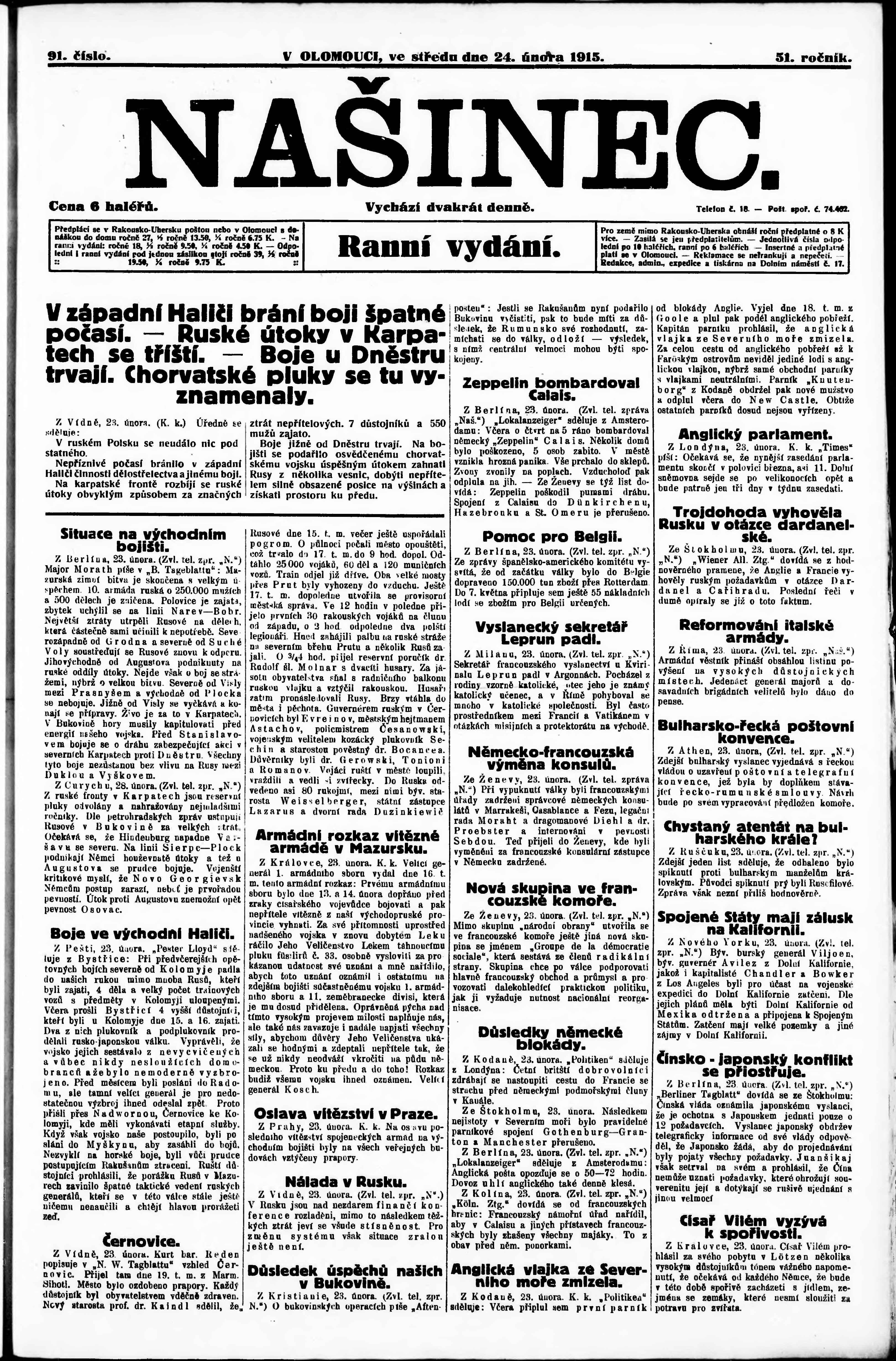 * Datum vydání výtisku: 24.2.1915 Číslo výtisku: 91 Poznámky k výtisku: ranní vydání;
