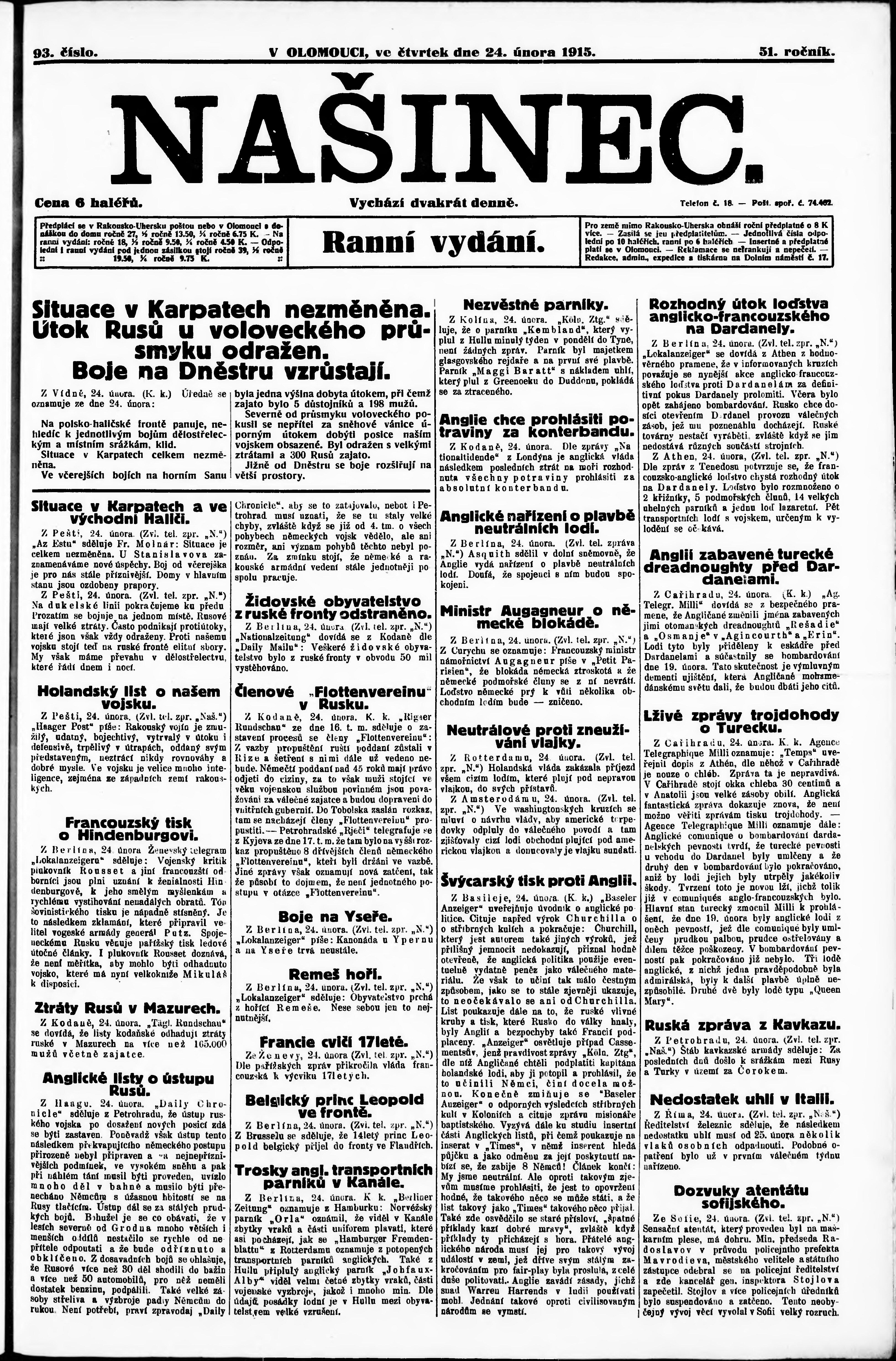 * Datum vydání výtisku: 24.2.1915 Číslo výtisku: 93 Poznámky k výtisku: ranní vydání;