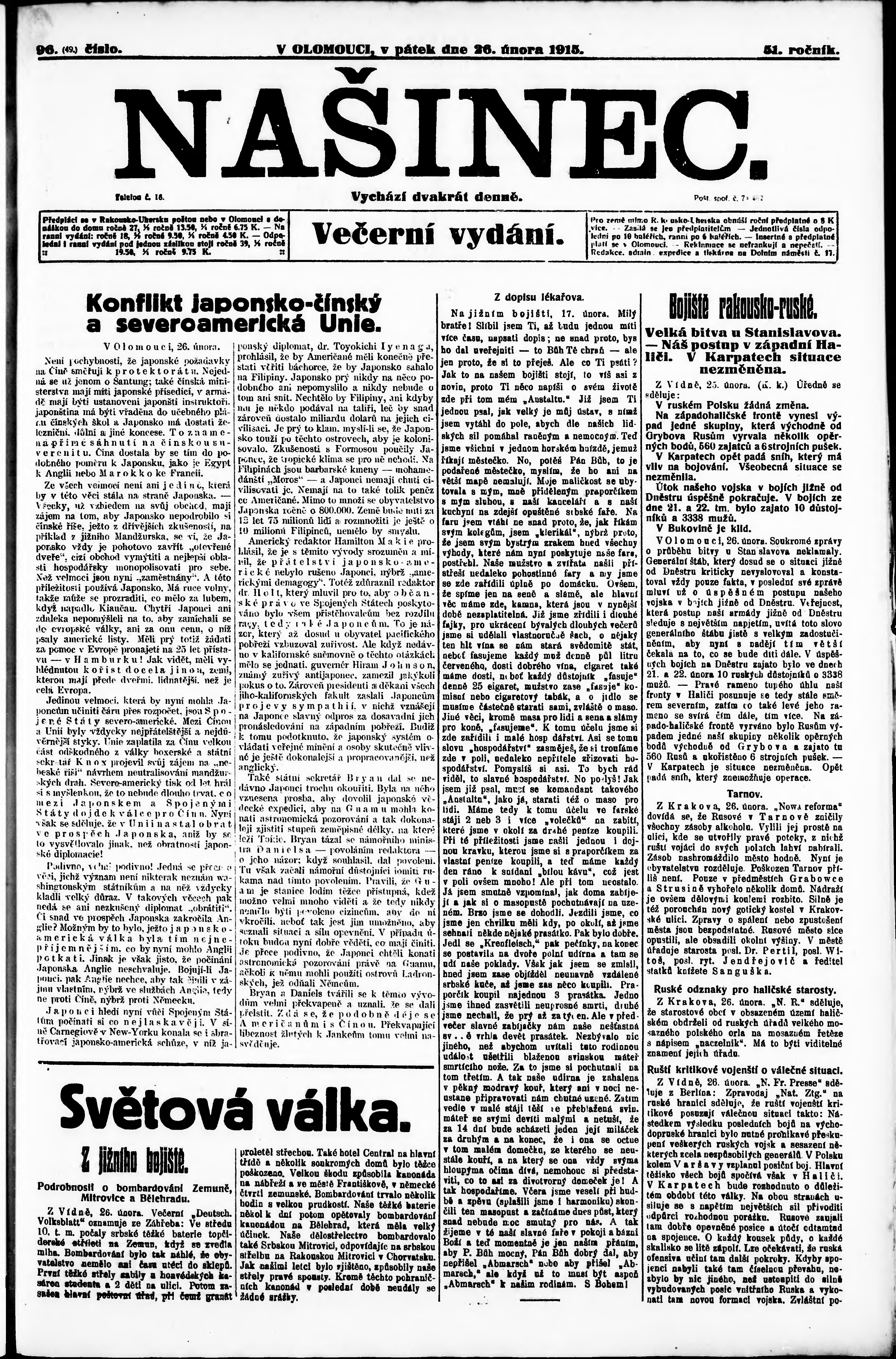 * Datum vydání výtisku: 26.2.1915 Číslo výtisku: 96 Poznámky k výtisku: večerní vydání;