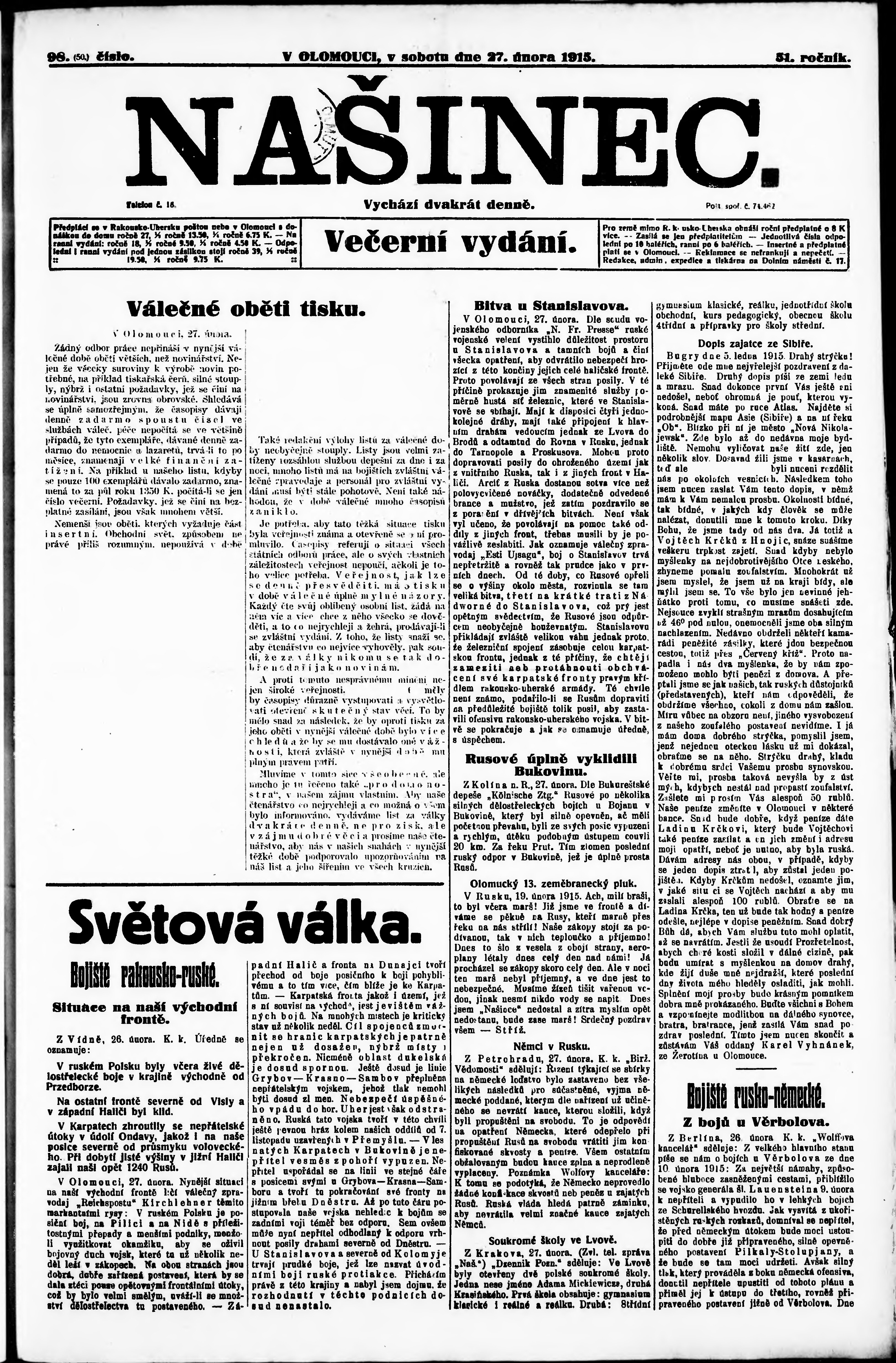 * Datum vydání výtisku: 27.2.1915 Číslo výtisku: 98 Poznámky k výtisku: večerní vydání;