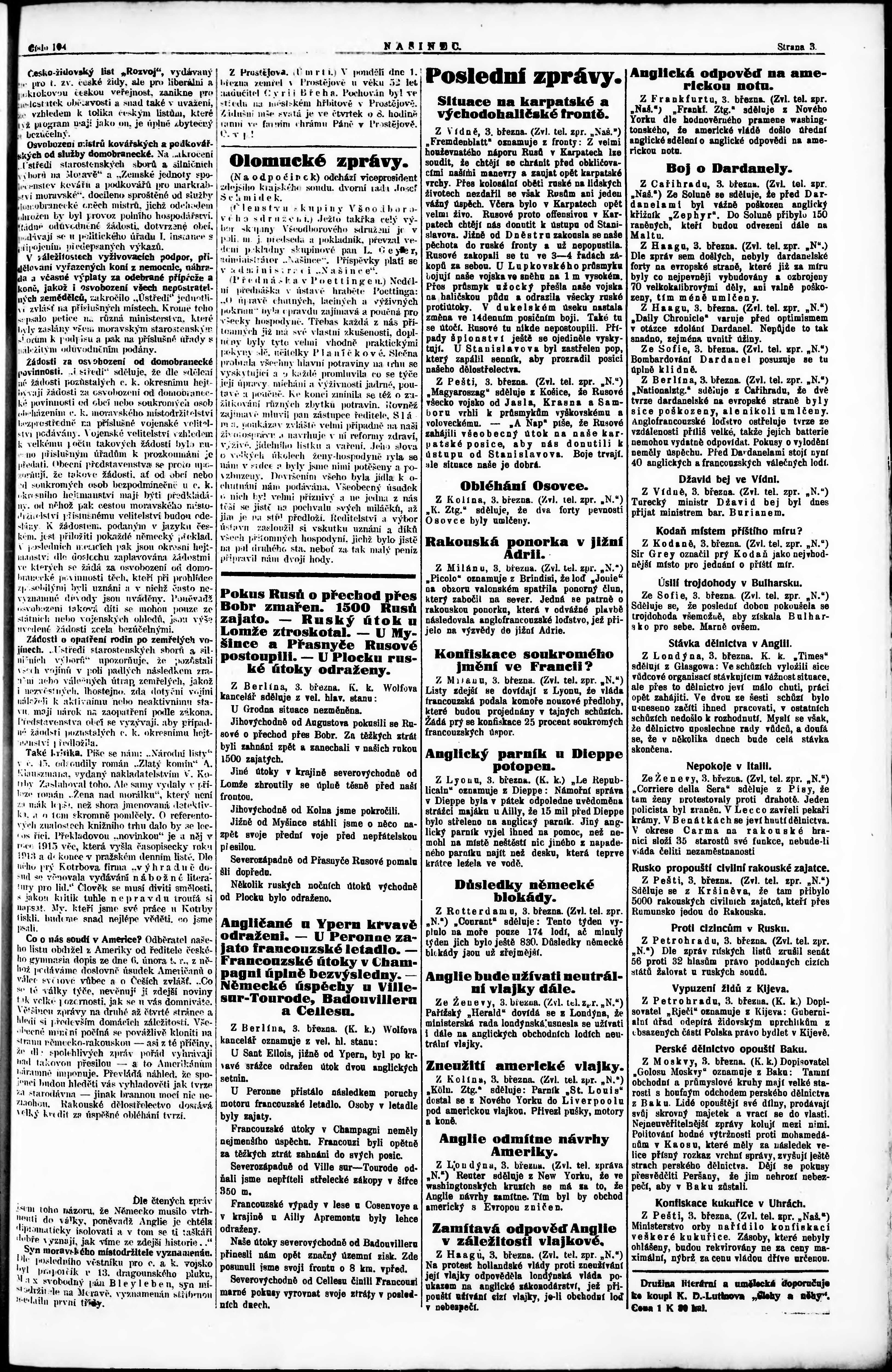 * Datum vydání výtisku: 3.3.1915 Číslo výtisku: 104 Poznámky k výtisku: večerní vydání;