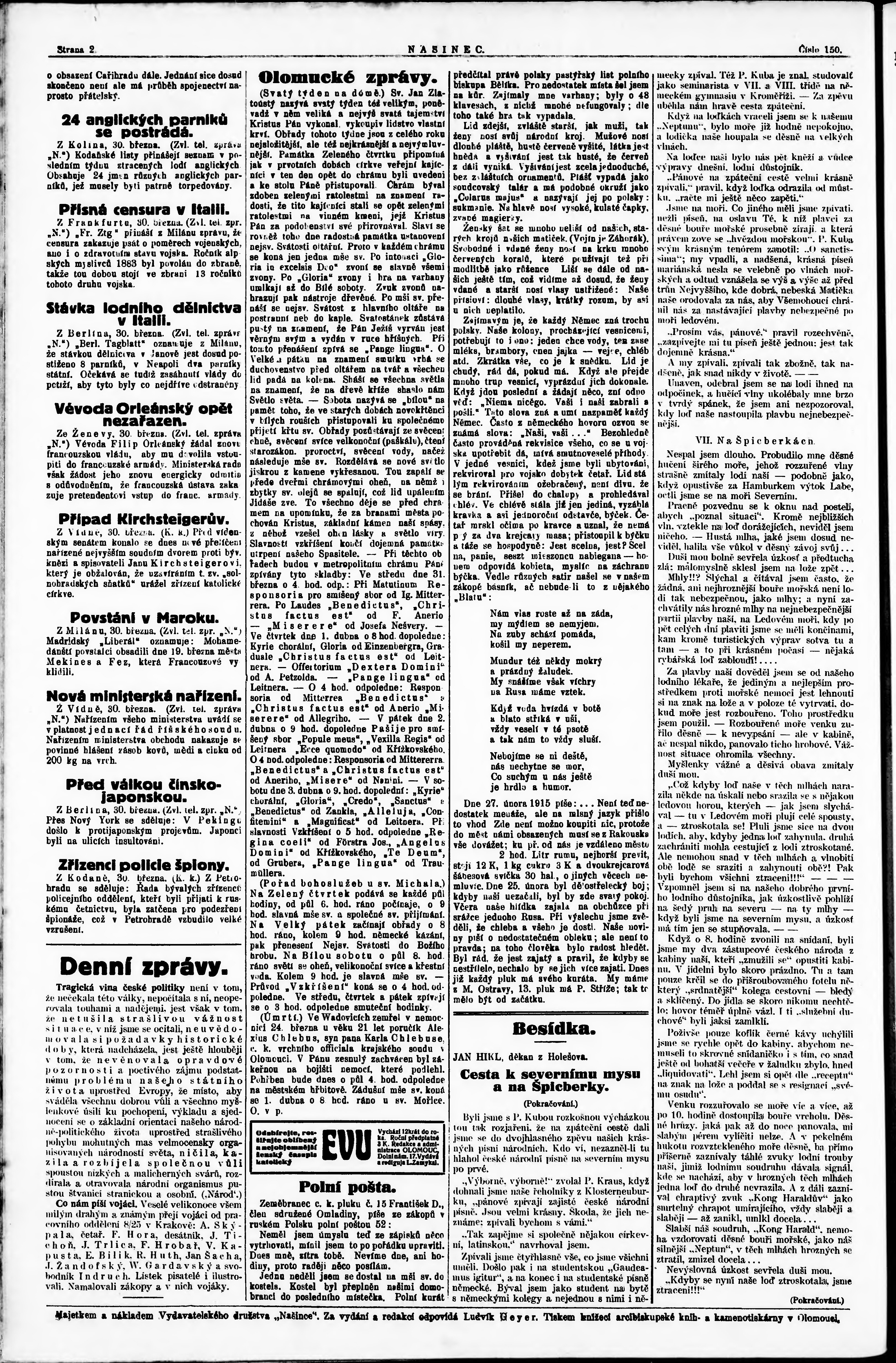 * Datum vydání výtisku: 31.3.1915 Číslo výtisku: 150 Poznámky k výtisku: ranní vydání;