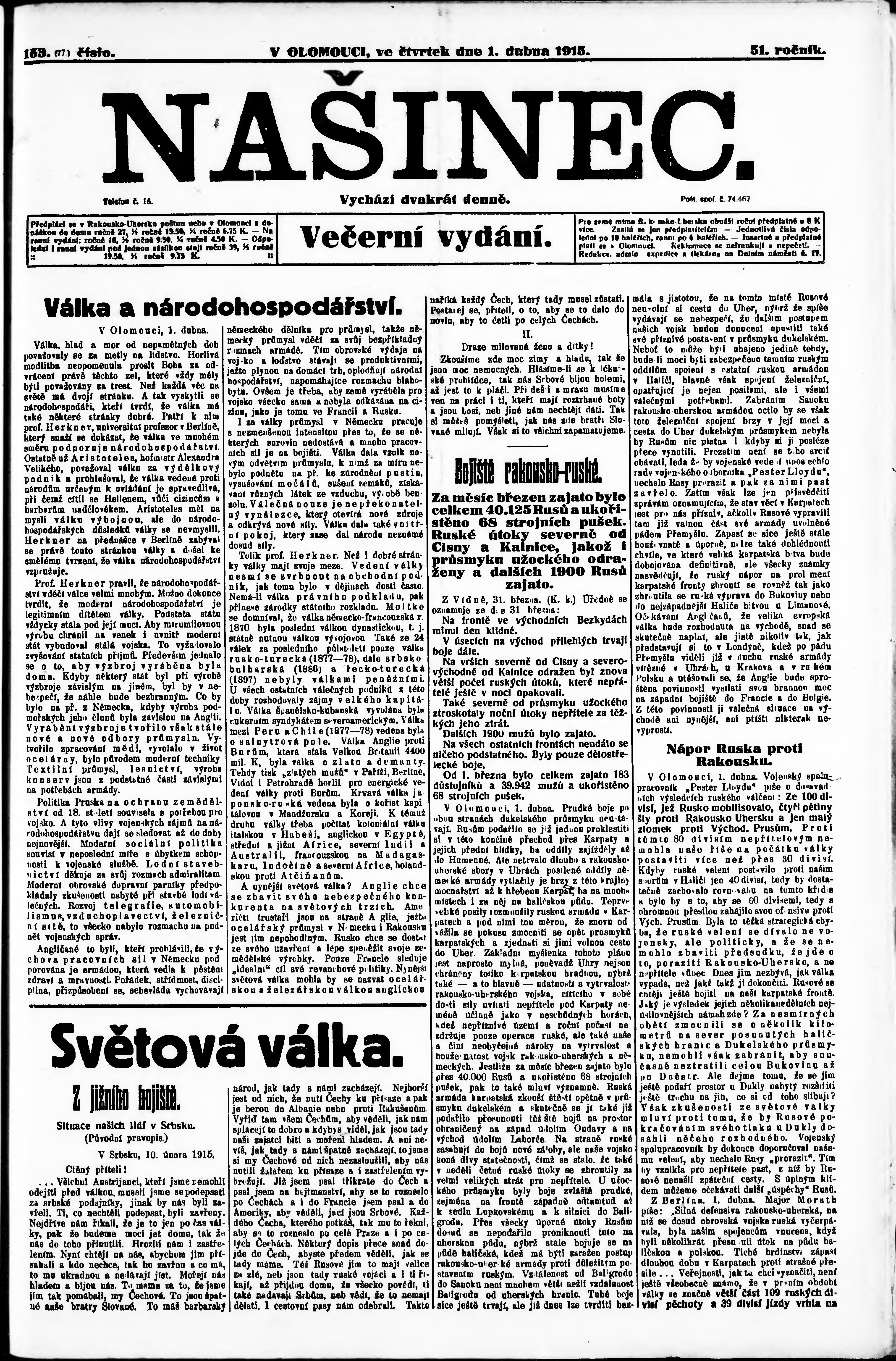 * Datum vydání výtisku: 1.4.1915 Číslo výtisku: 153 Poznámky k výtisku: večerní vydání;
