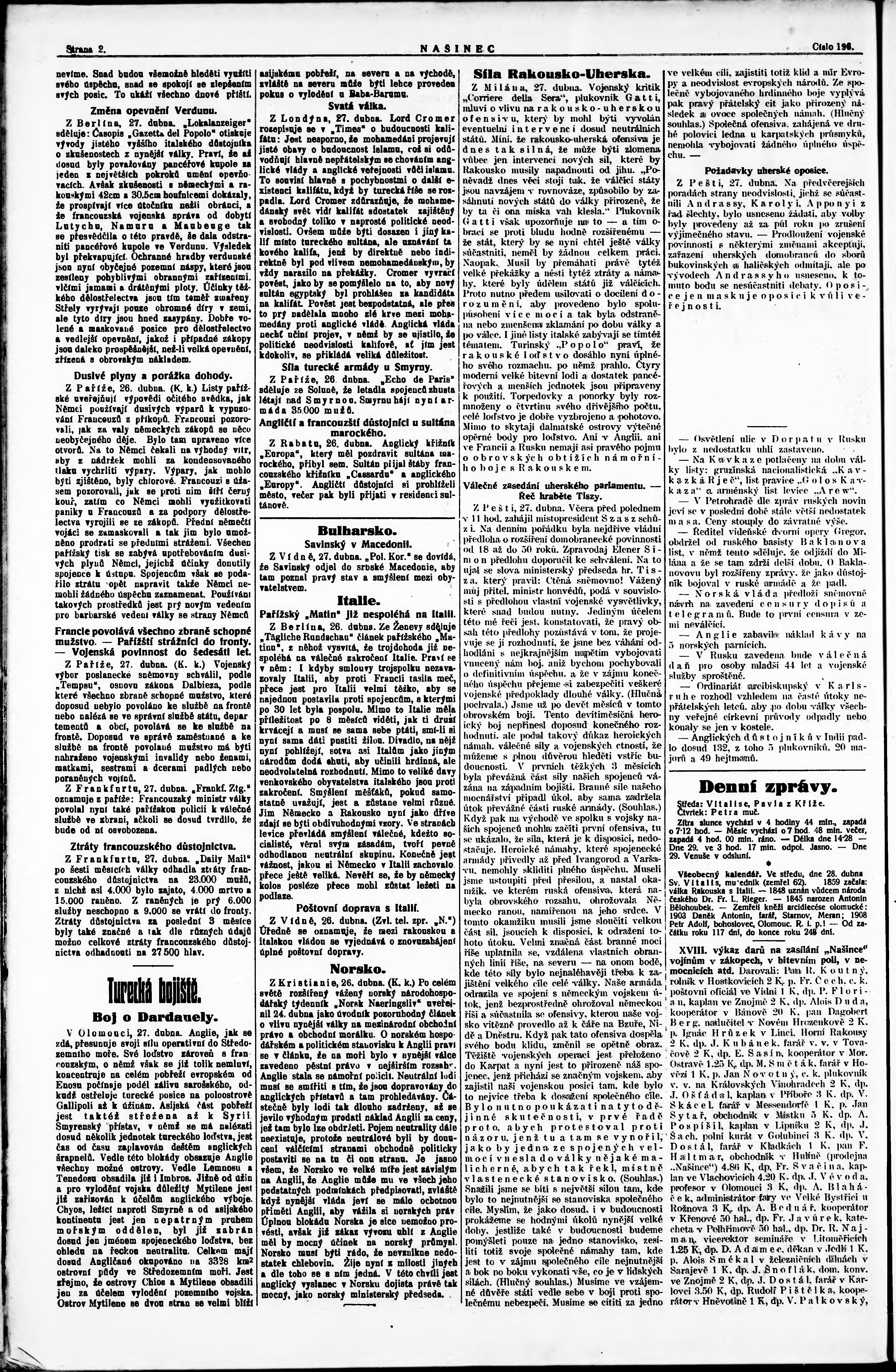 * Datum vydání výtisku: 27.4.1915 Číslo výtisku: 196 Poznámky k výtisku: večerní vydání;