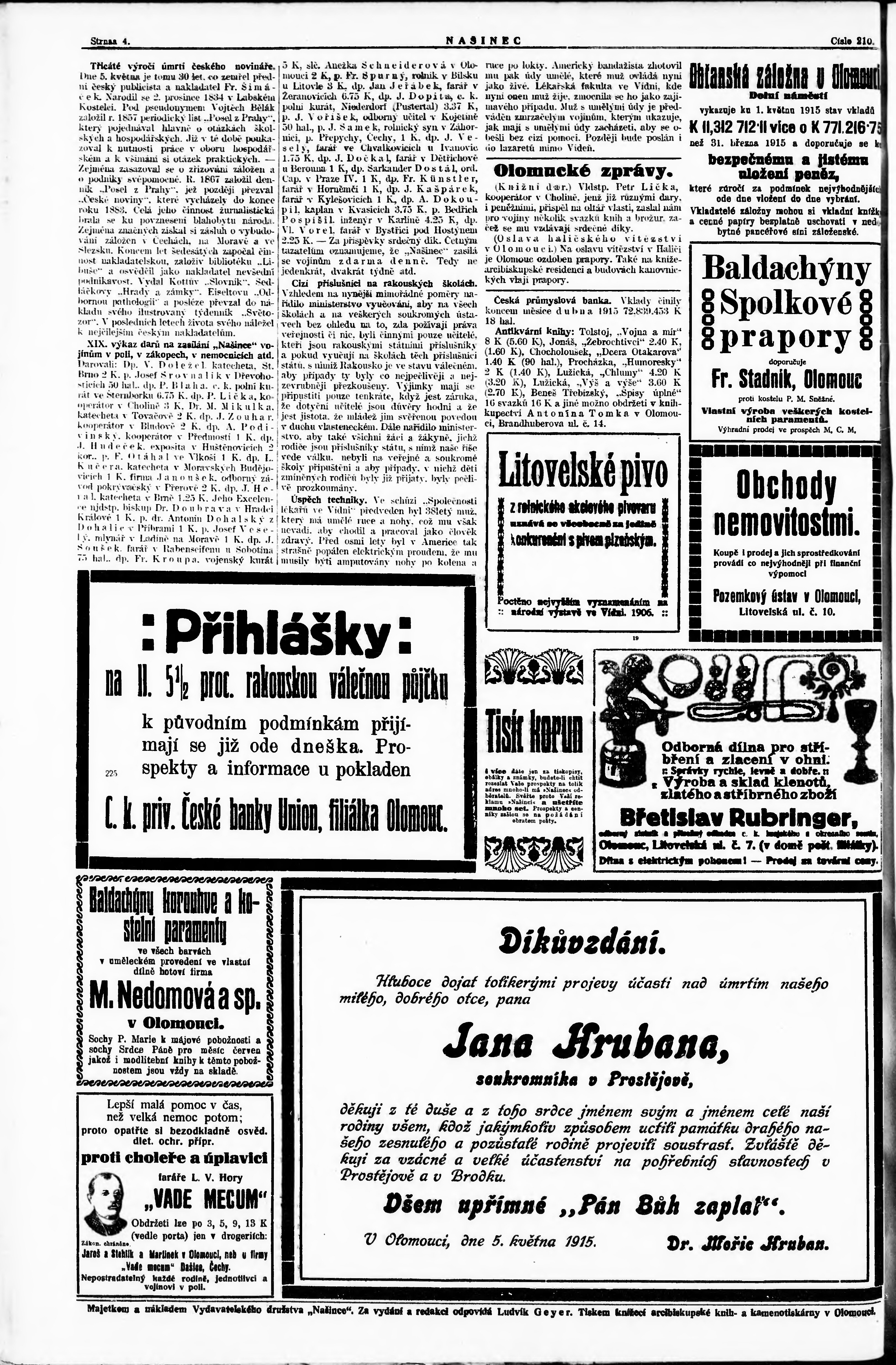 * Datum vydání výtisku: 5.5.1915 Číslo výtisku: 210 Poznámky k výtisku: večerní vydání;