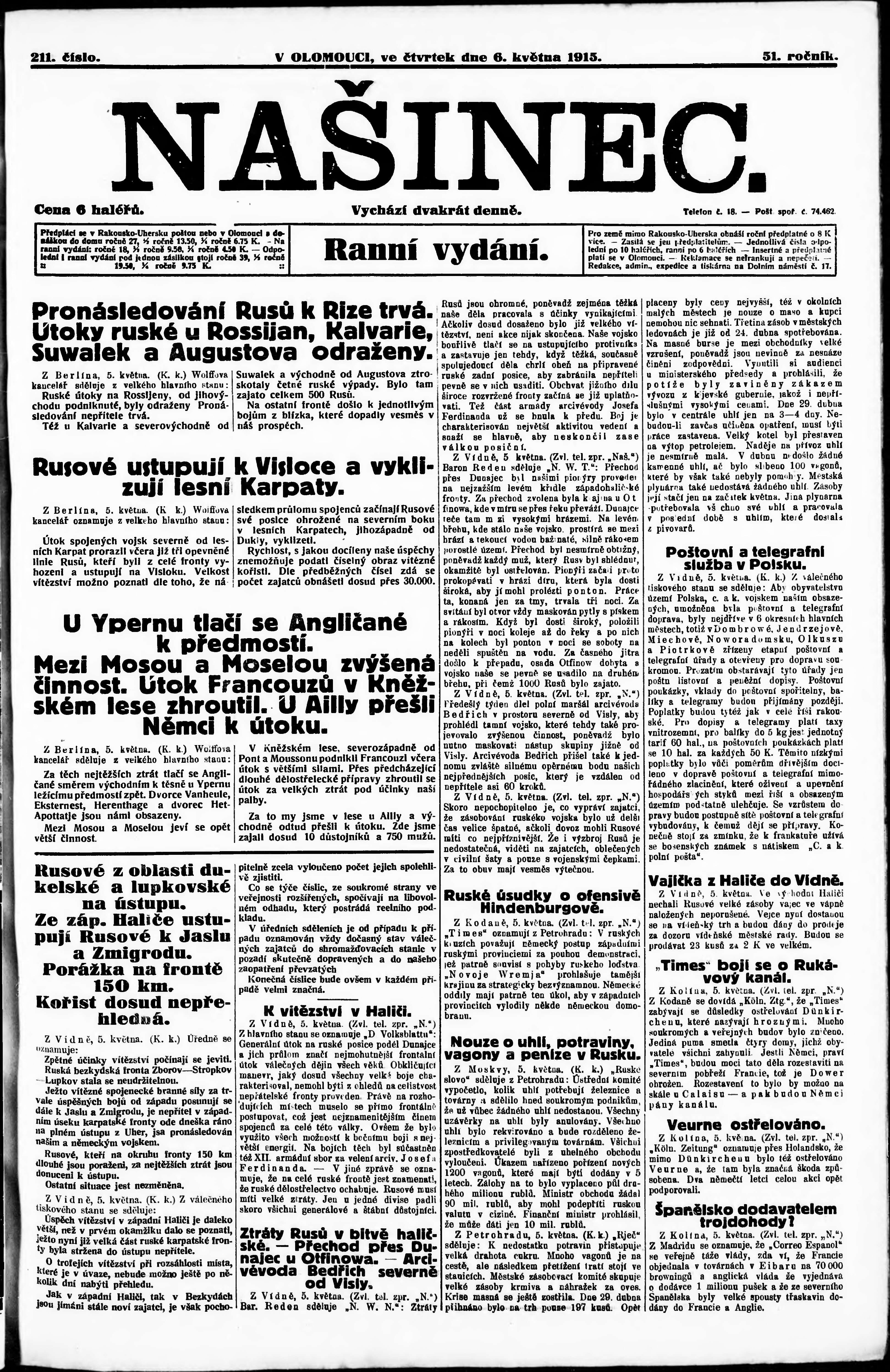 * Datum vydání výtisku: 6.5.1915 Číslo výtisku: 211 Poznámky k výtisku: ranní vydání;