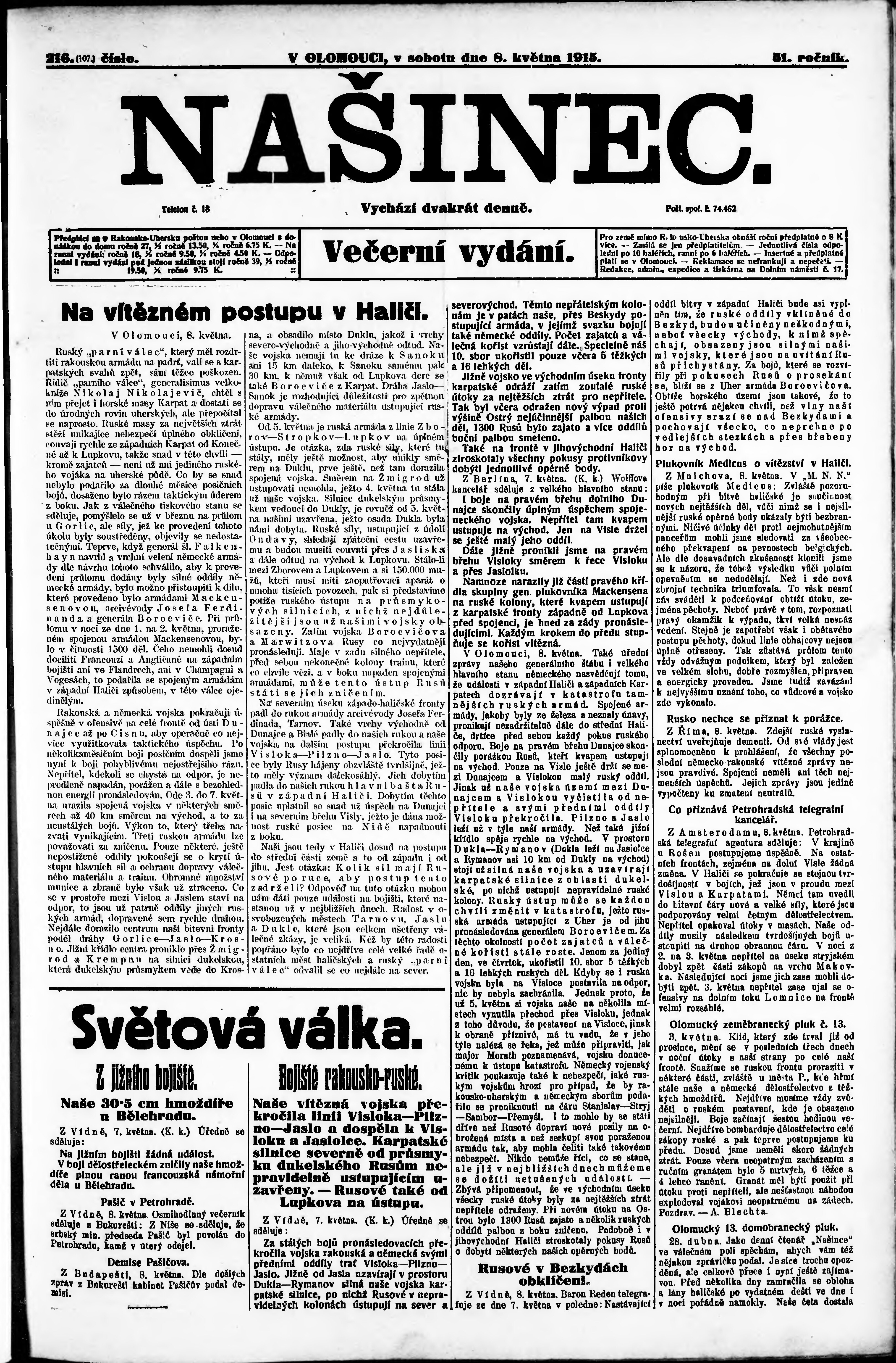 * Datum vydání výtisku: 8.5.1915 Číslo výtisku: 216 Poznámky k výtisku: večerní vydání;