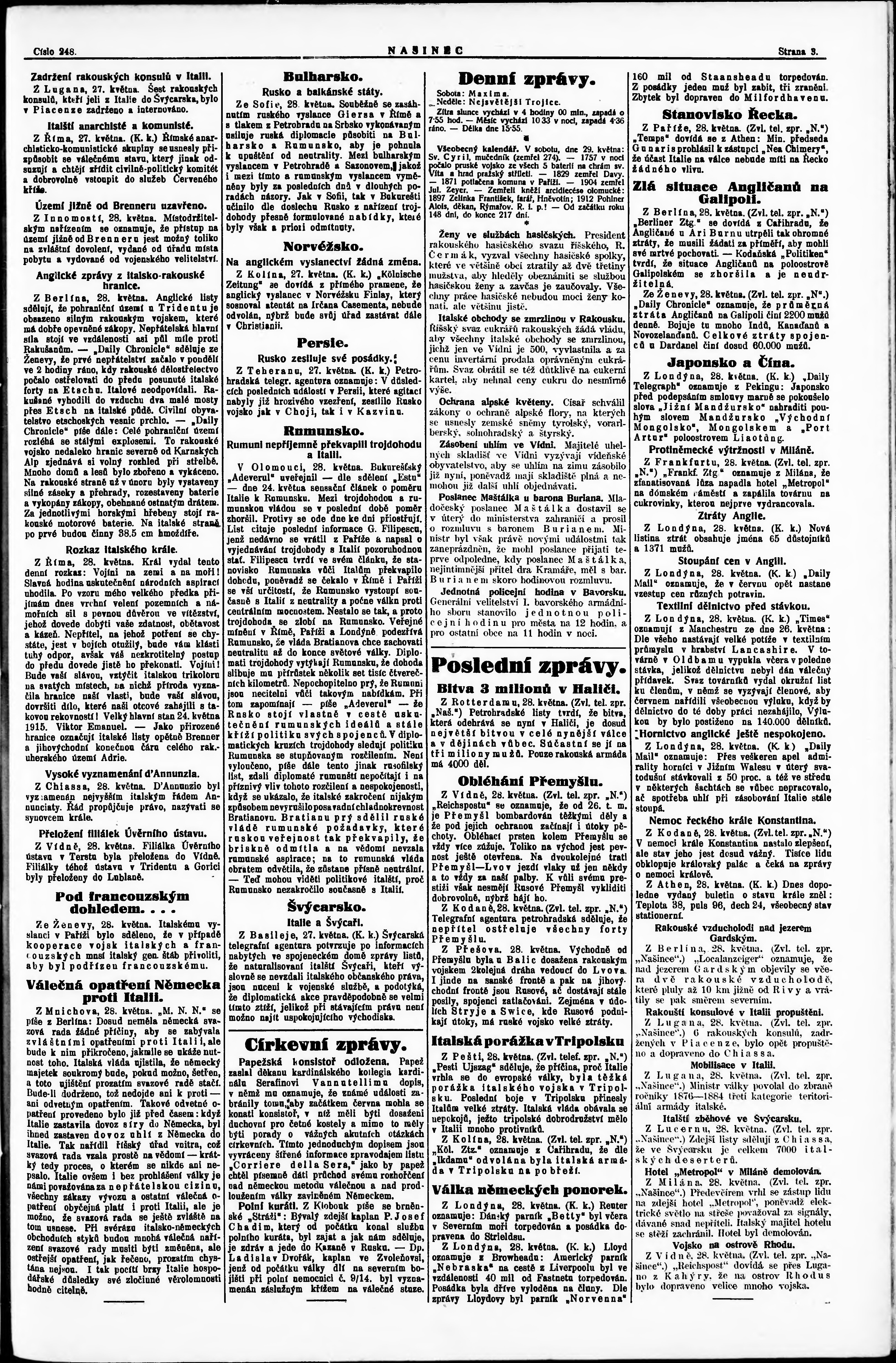 * Datum vydání výtisku: 28.5.1915 Číslo výtisku: 248 Poznámky k výtisku: večerní vydání;