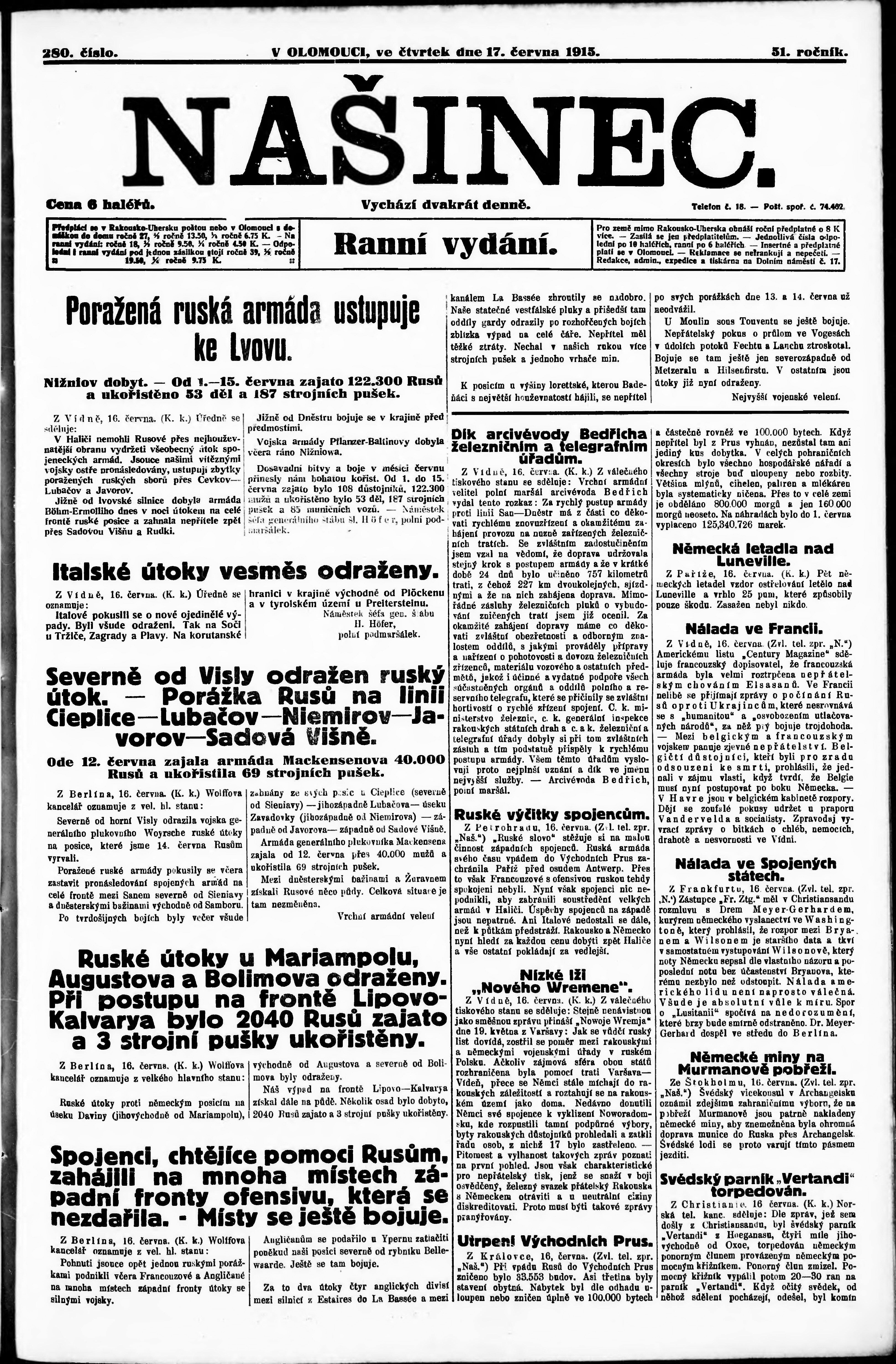* Datum vydání výtisku: 17.6.1915 Číslo výtisku: 280 Poznámky k výtisku: ranní vydání;