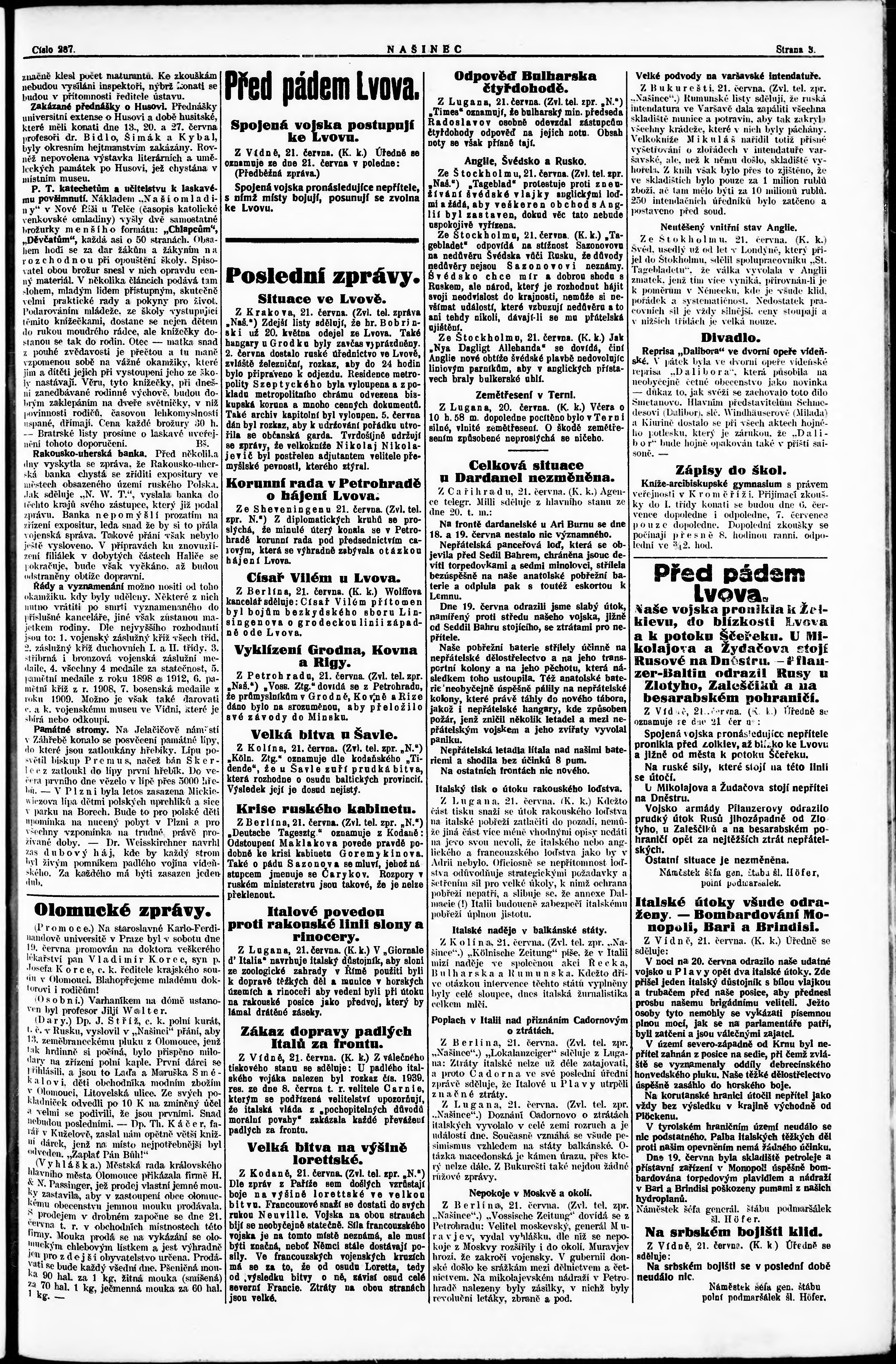 * Datum vydání výtisku: 21.6.1915 Číslo výtisku: 287 Poznámky k výtisku: večerní vydání;