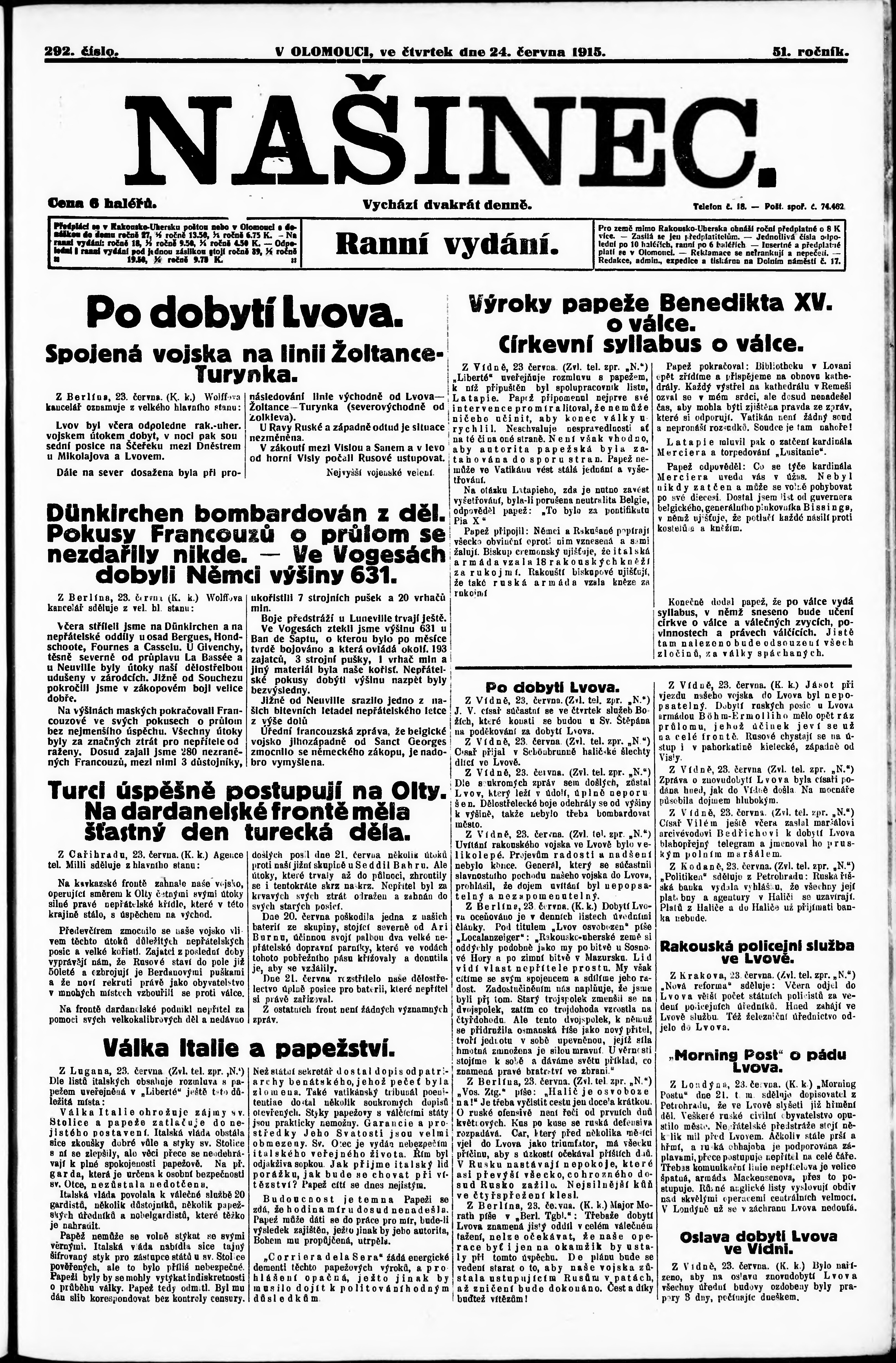 * Datum vydání výtisku: 24.6.1915 Číslo výtisku: 292 Poznámky k výtisku: ranní vydání;