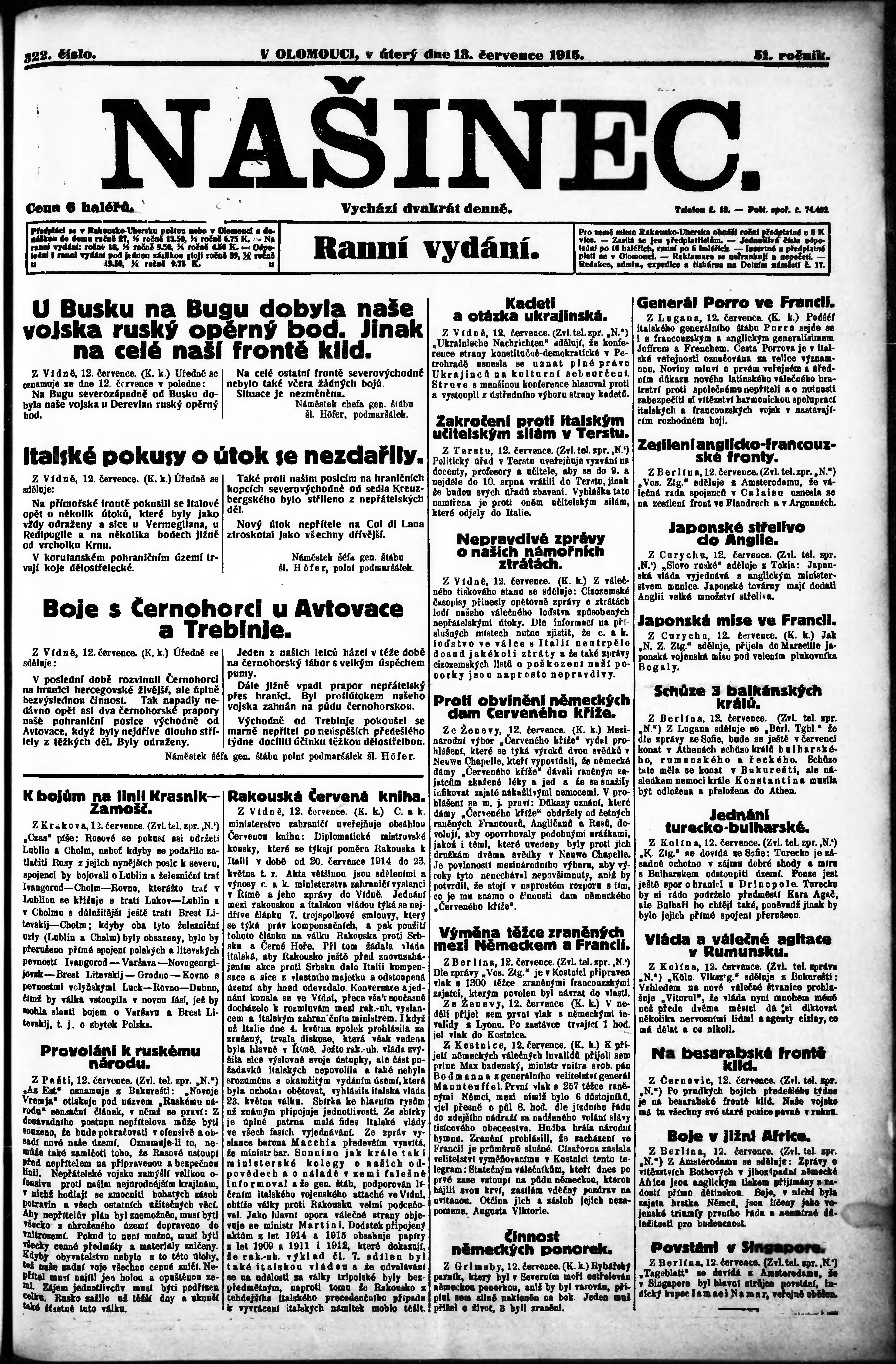 * Datum vydání výtisku: 13.7.1915 Číslo výtisku: 322 Poznámky k výtisku: ranní vydání;
