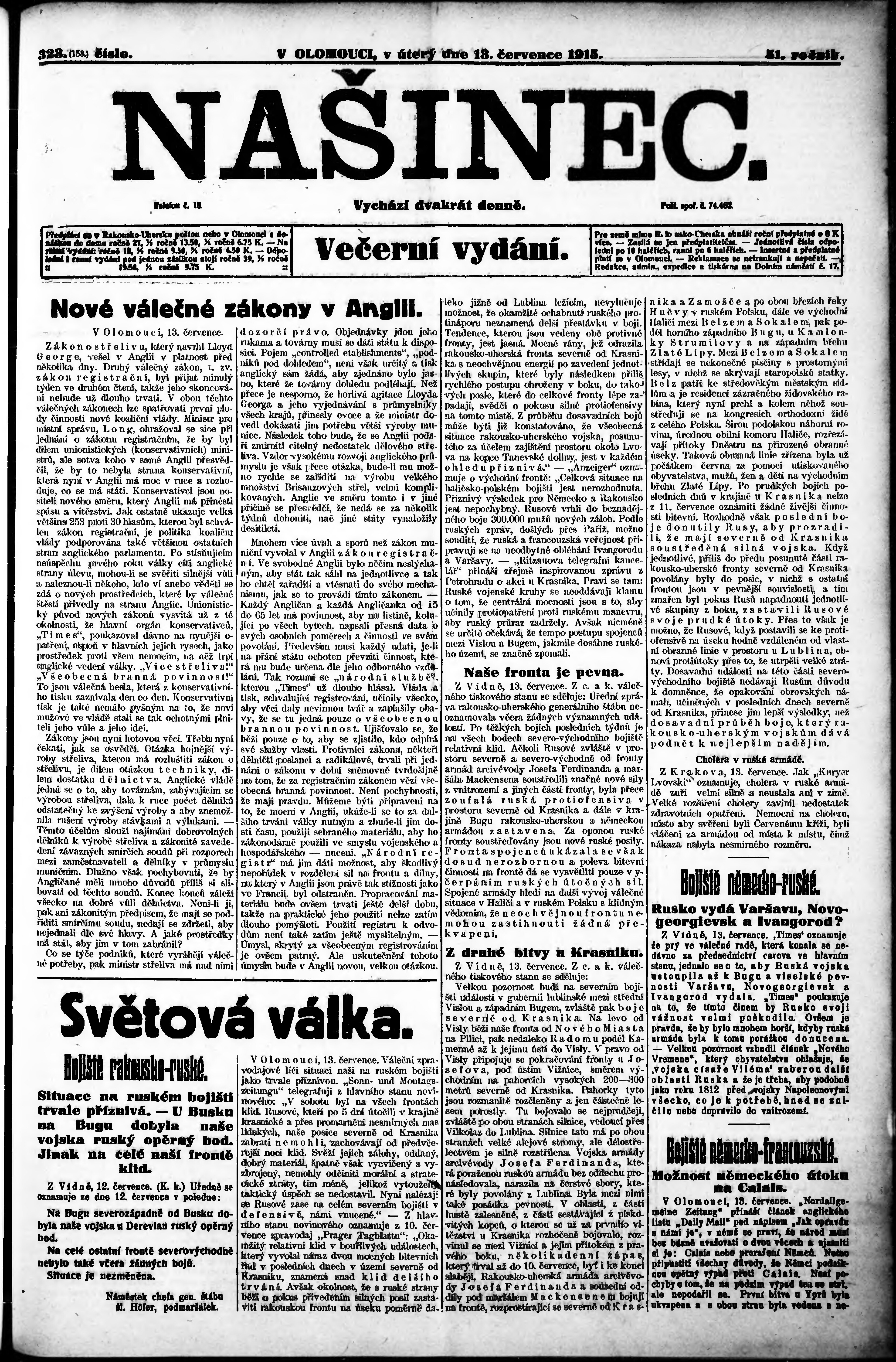 * Datum vydání výtisku: 13.7.1915 Číslo výtisku: 323 Poznámky k výtisku: večerní vydání;
