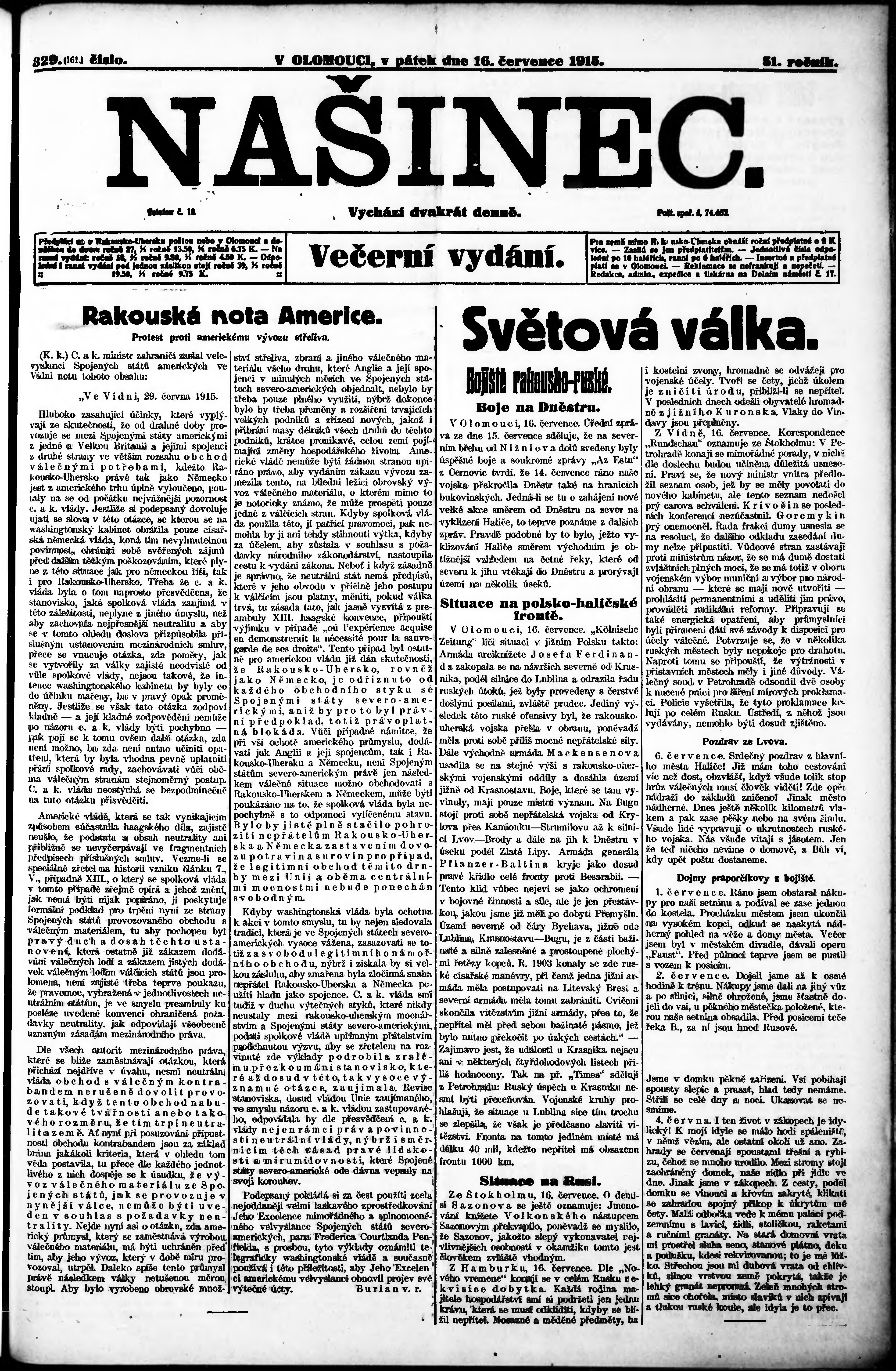 * Datum vydání výtisku: 16.7.1915 Číslo výtisku: 329 Poznámky k výtisku: večerní vydání;