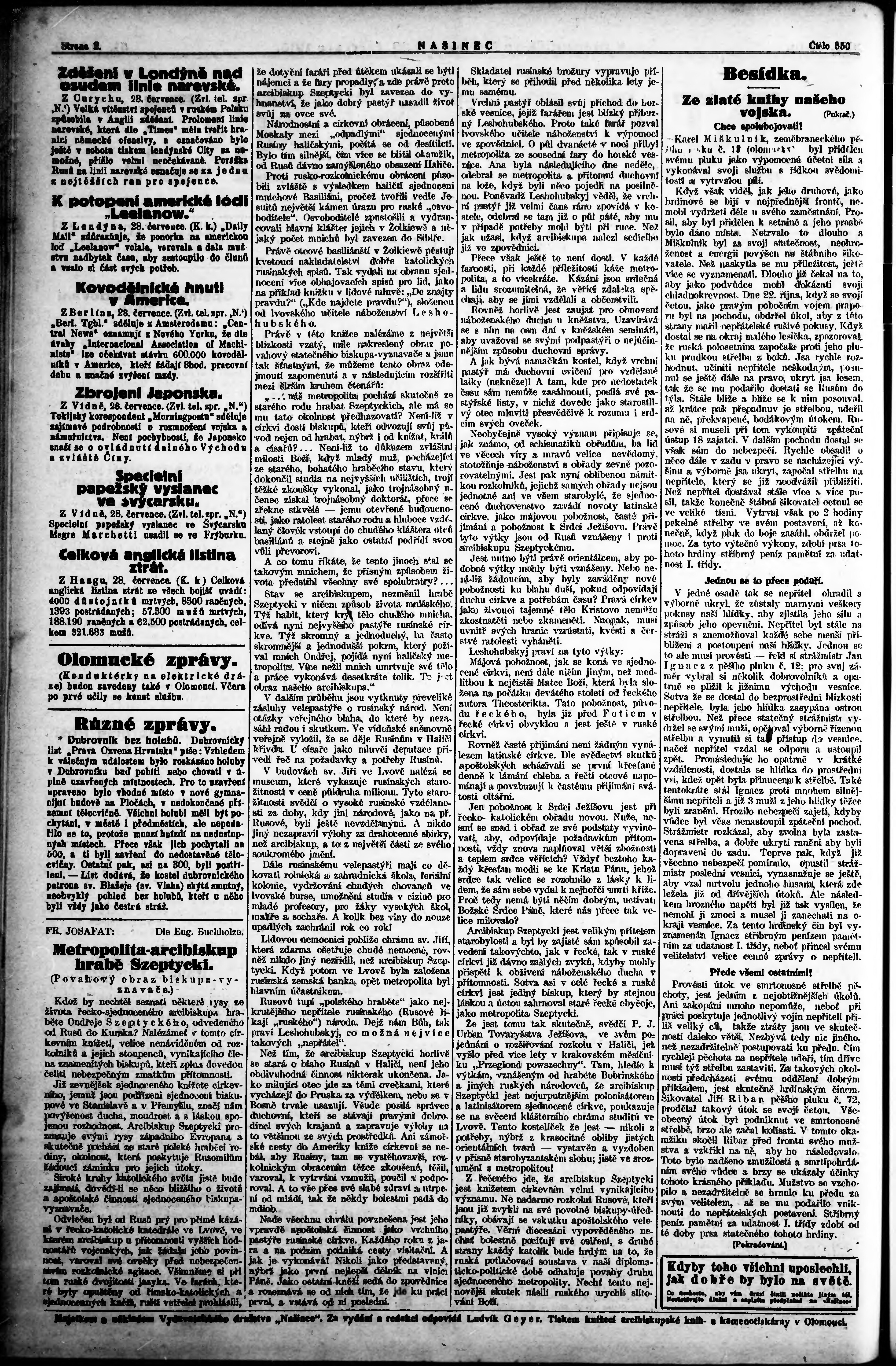 * Datum vydání výtisku: 29.7.1915 Číslo výtisku: 350 Poznámky k výtisku: ranní vydání;