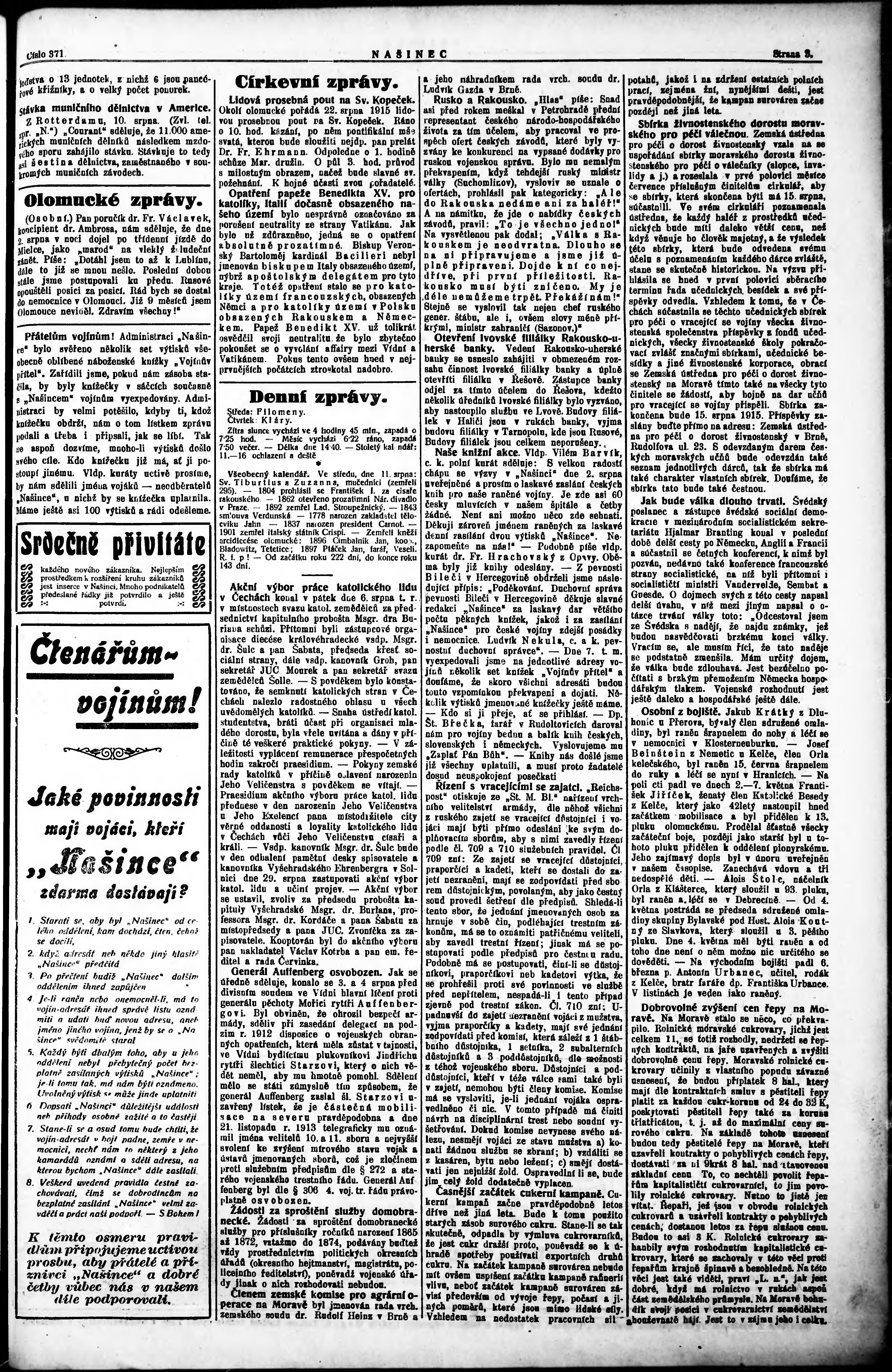 * Datum vydání výtisku: 10.8.1915 Číslo výtisku: 371 Poznámky k výtisku: večerní vydání;