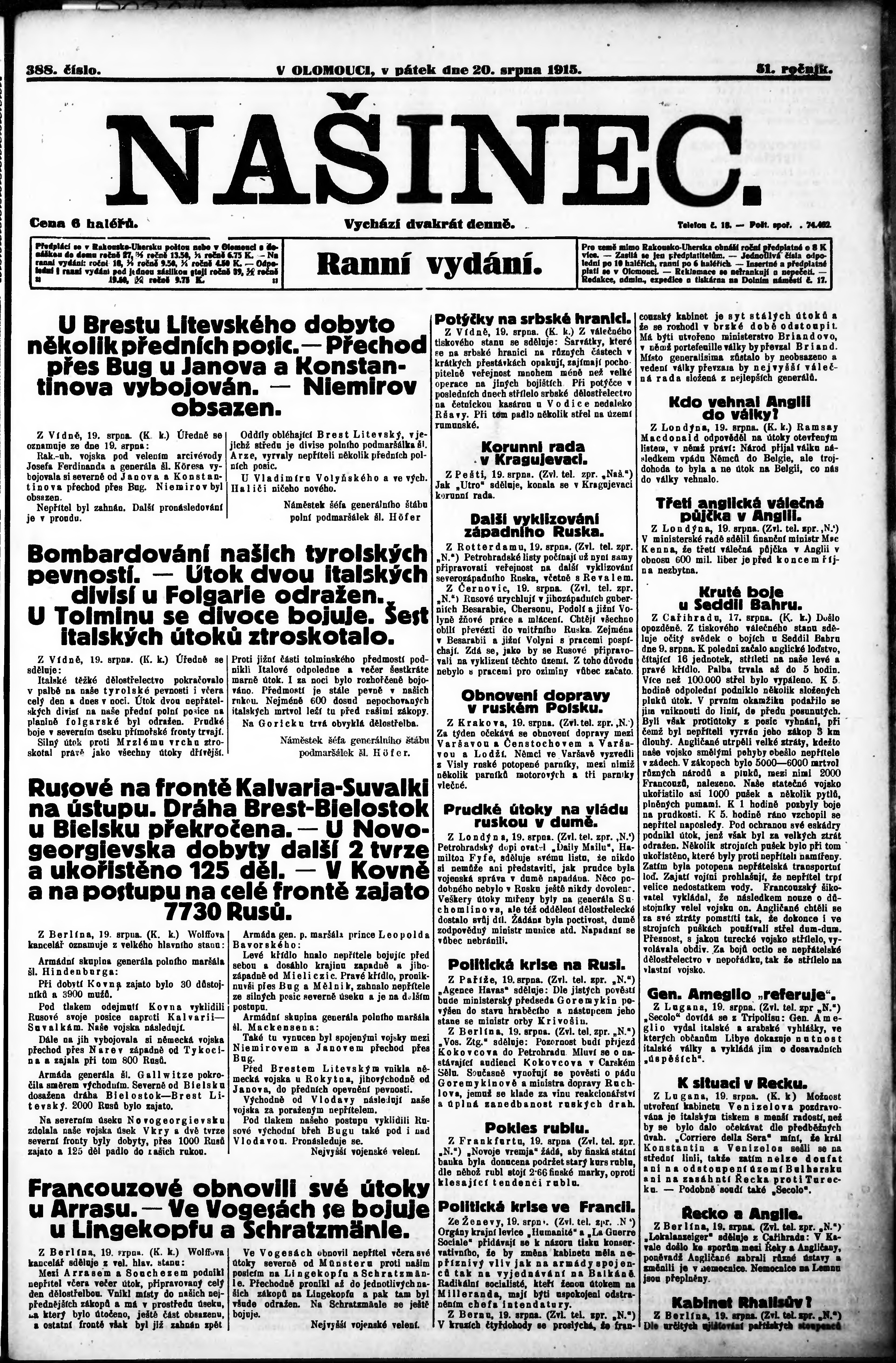 * Datum vydání výtisku: 20.8.1915 Číslo výtisku: 388 Poznámky k výtisku: ranní vydání;