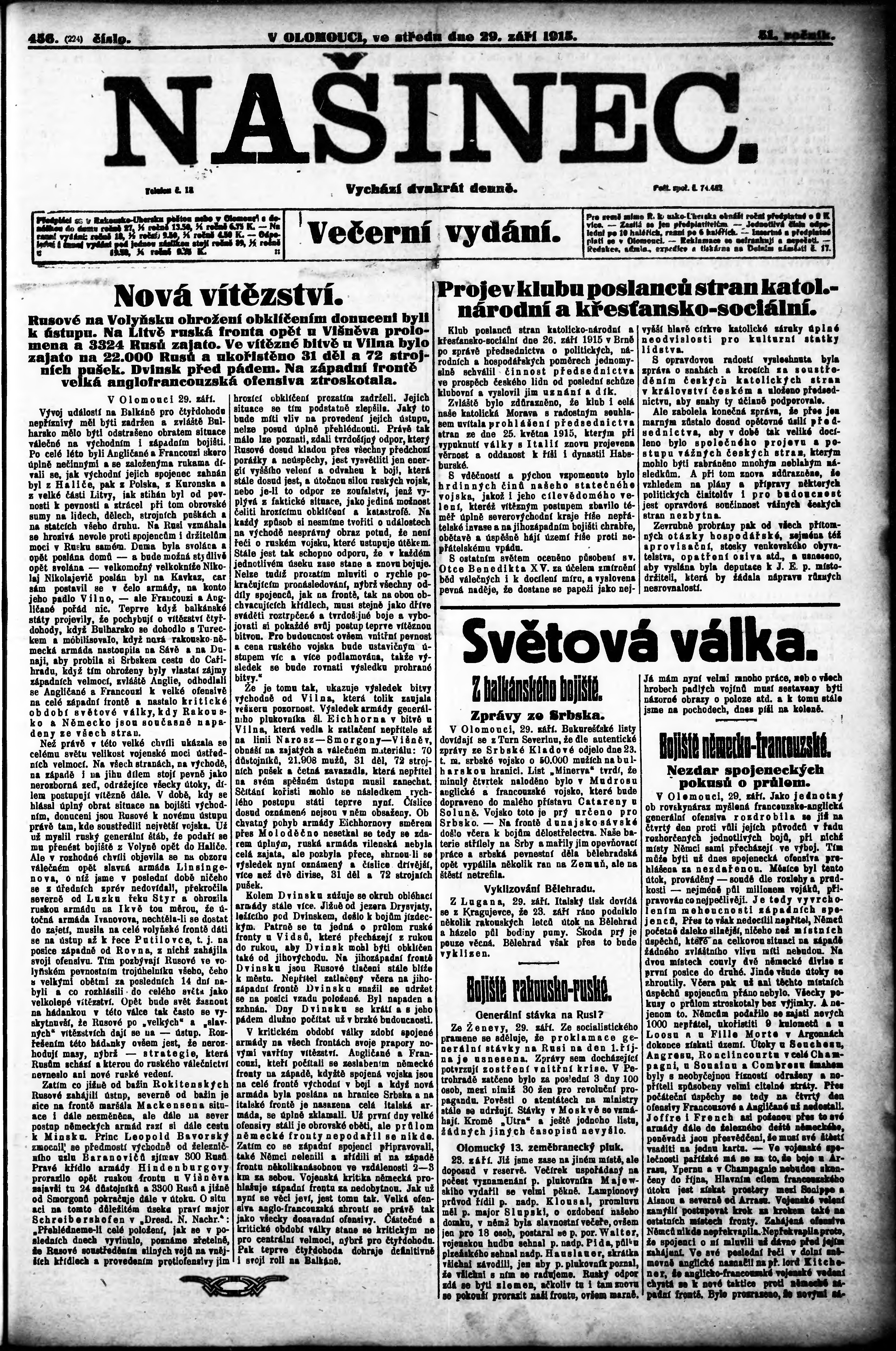 * Datum vydání výtisku: 29.9.1915 Číslo výtisku: 456 Poznámky k výtisku: večerní vydání;