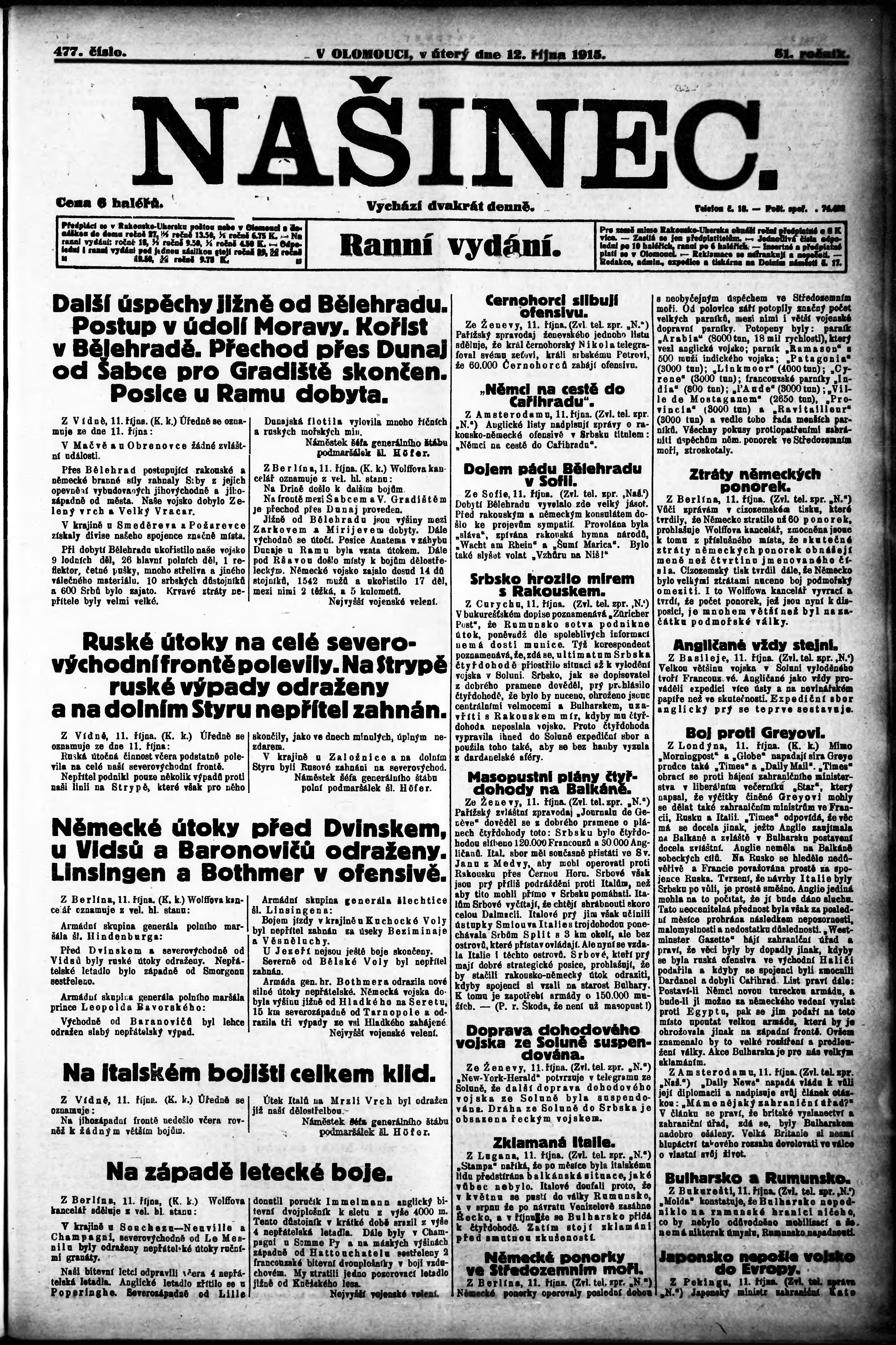 * Datum vydání výtisku: 12.10.1915 Číslo výtisku: 477 Poznámky k výtisku: ranní vydání;